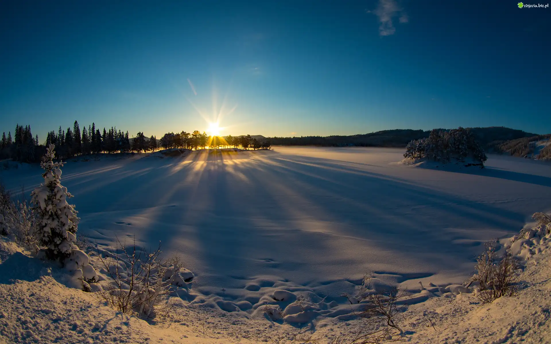 Zdjęcie Zima, Śnieg, Drzewa, Promienie słońca