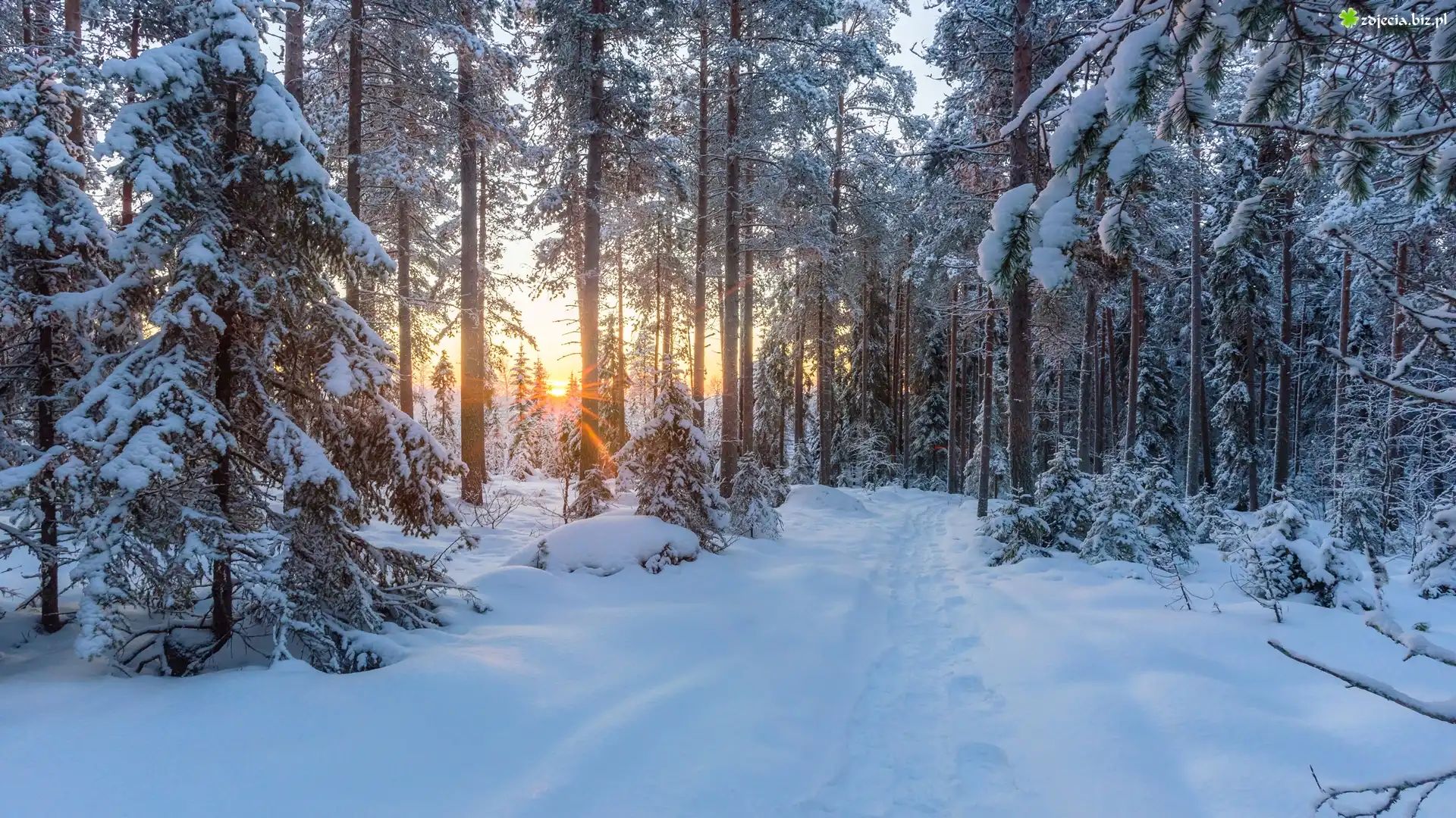 Zdjęcie Zima, Drzewa, Las, Promienie słońca