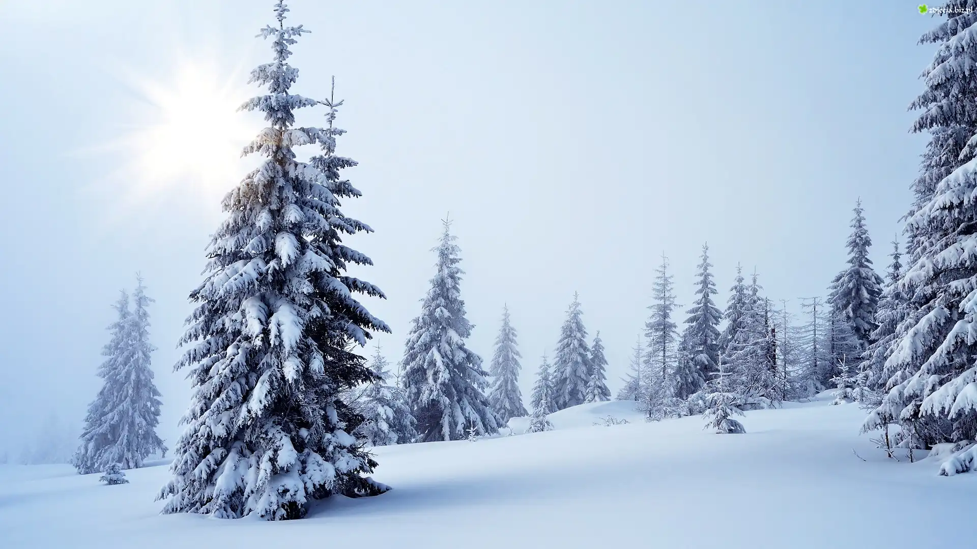 Zdjęcie Zima, Drzewa, Świerki, Promienie słońca