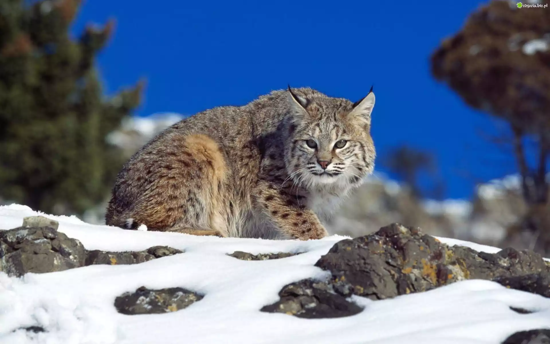Zdjęcie, Zima, Ryś, Ośnieżone, Skały, Roślinność, Rozmycie