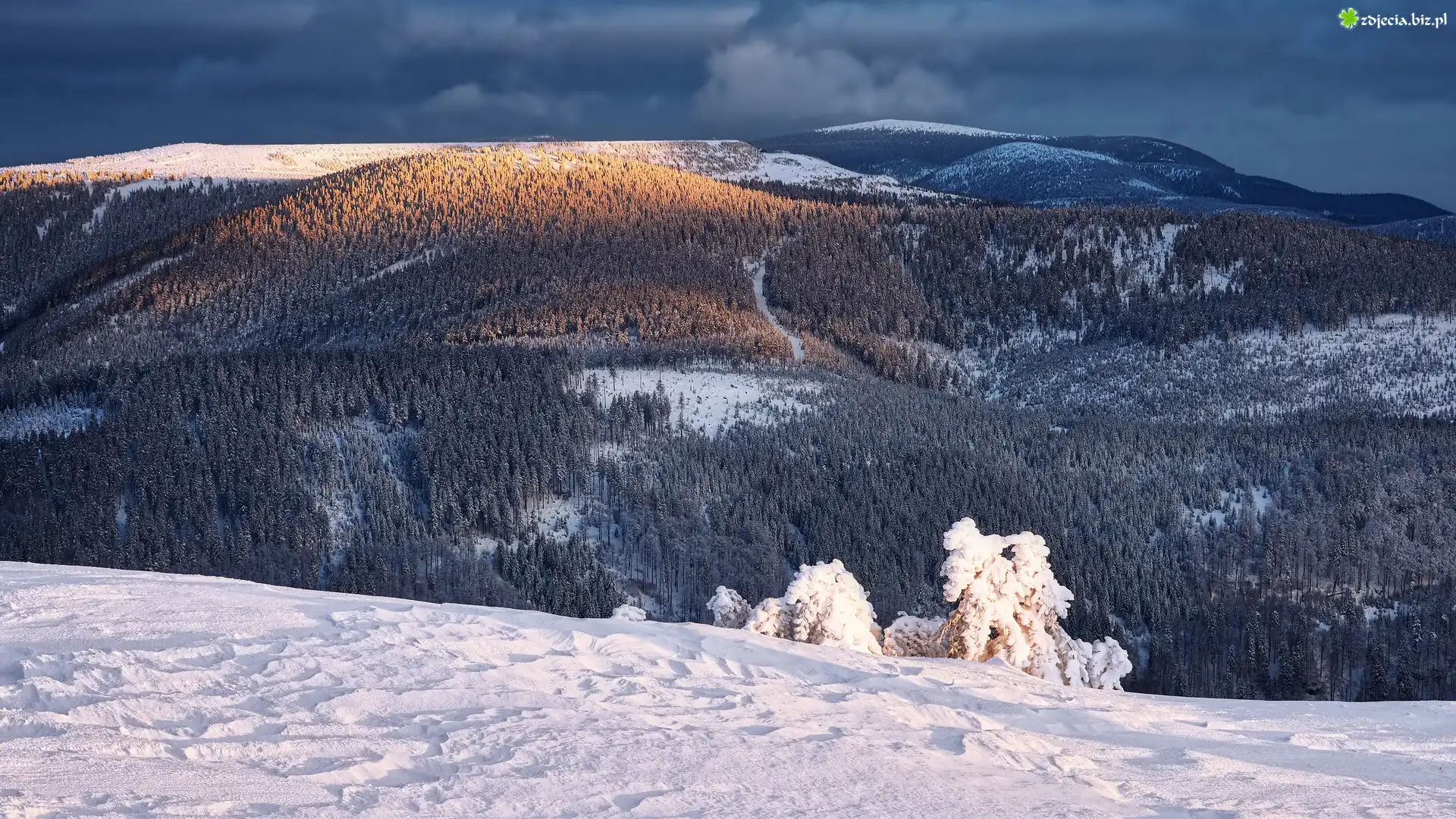Zdjęcie Zima, Góry, Lasy, Ośnieżone, Rośliny, Chmury