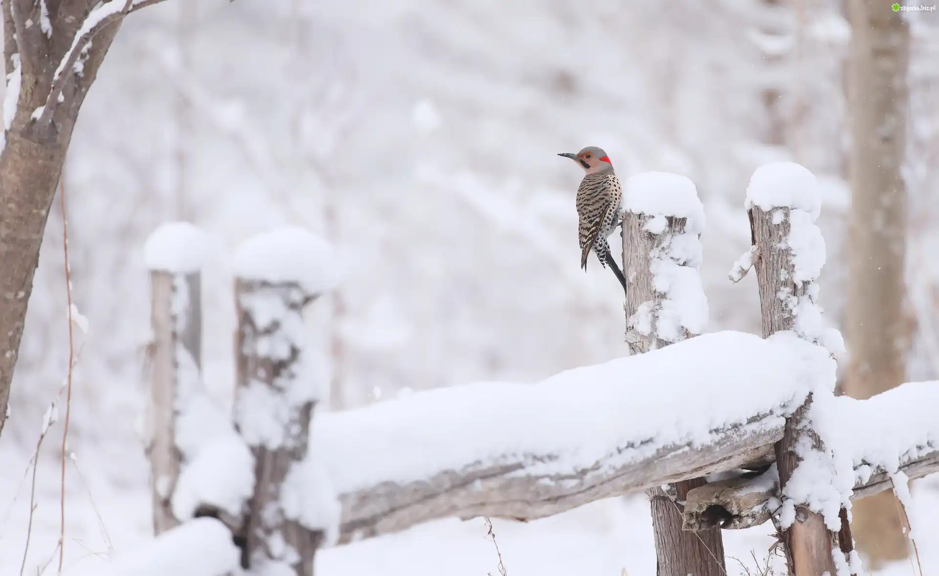 Zdjęcie Ptak, Dzięcioł różowoszyi, Zima, Śnieg, Drewniane, Ogrodzenie
