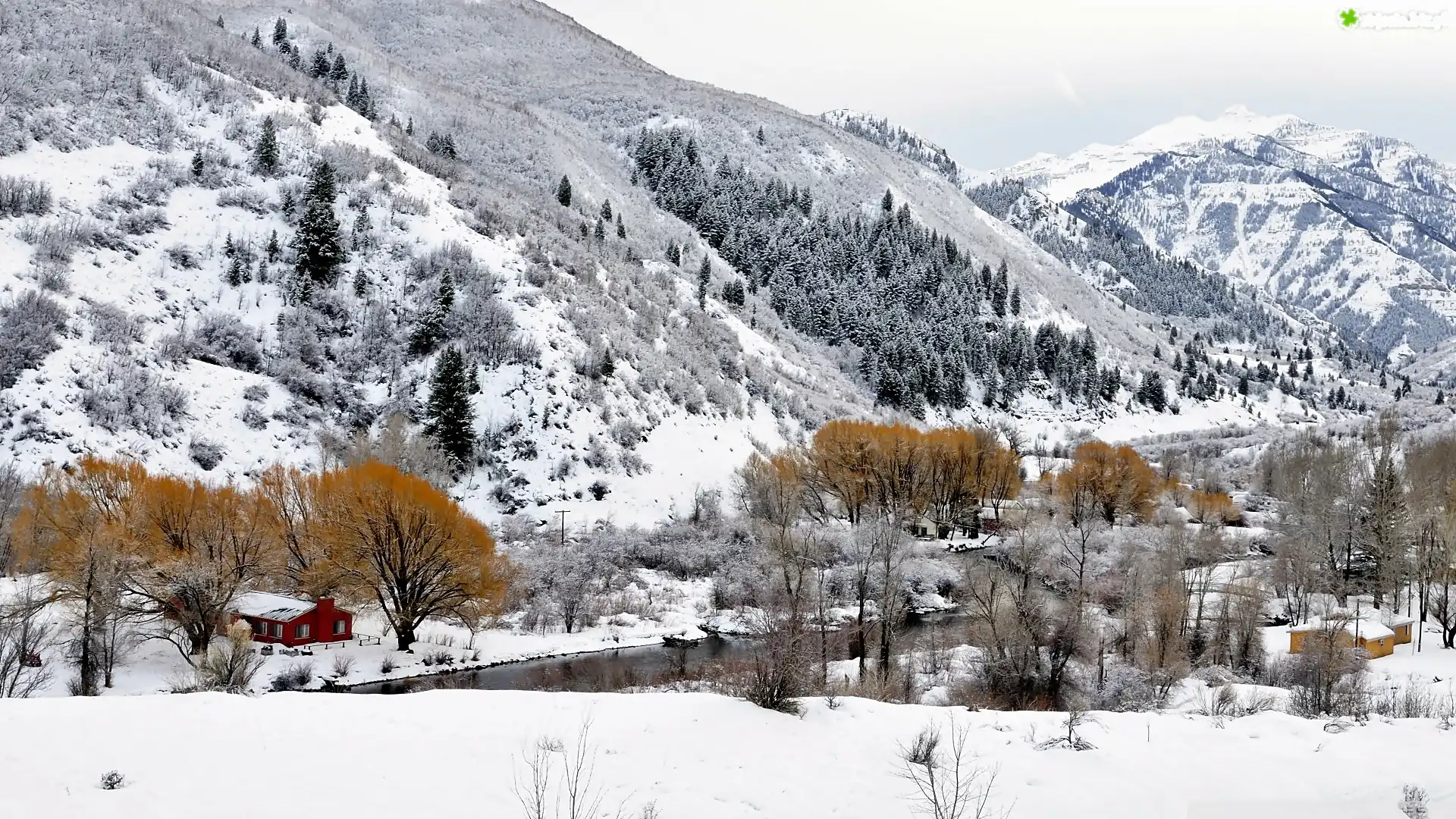 Zdjęcie Zima, Góry, Lasy, Rzeka, Domy