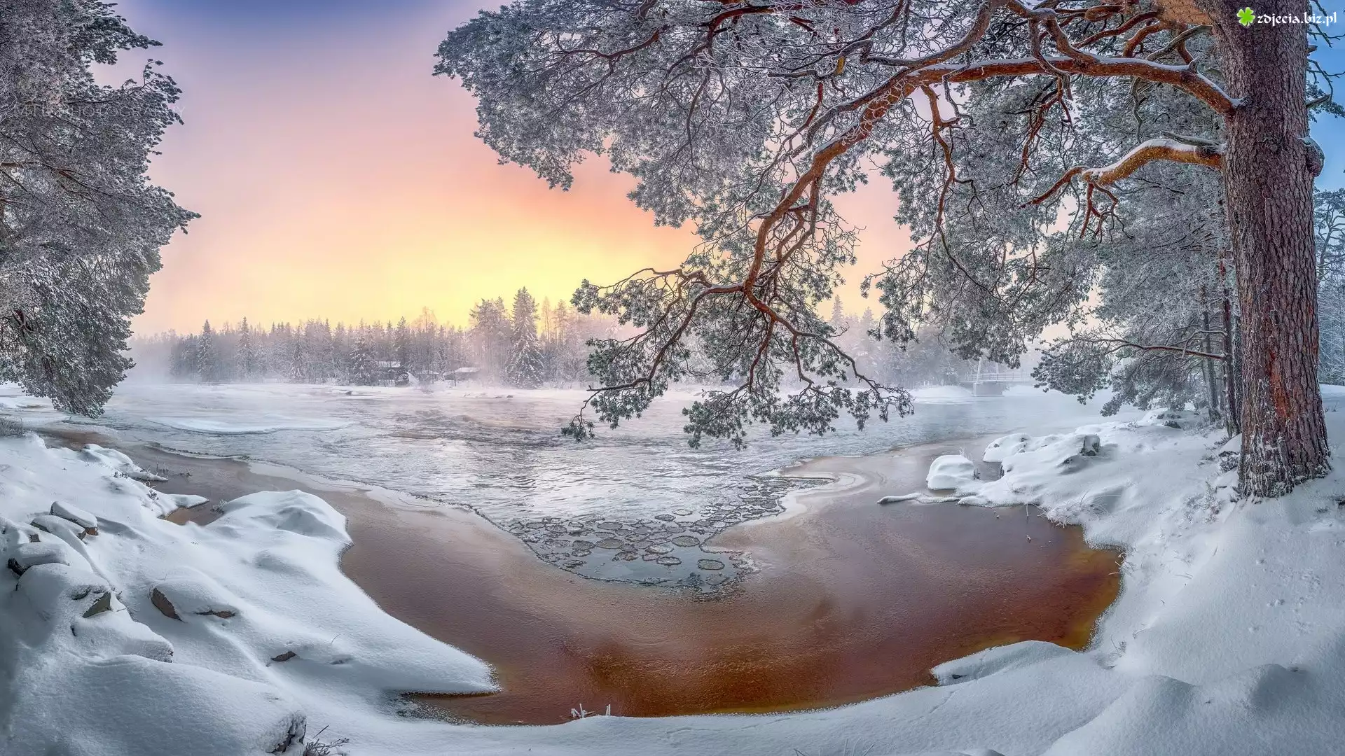 Zdjęcie Zima, Zachód słońca, Rzeka, Drzewa