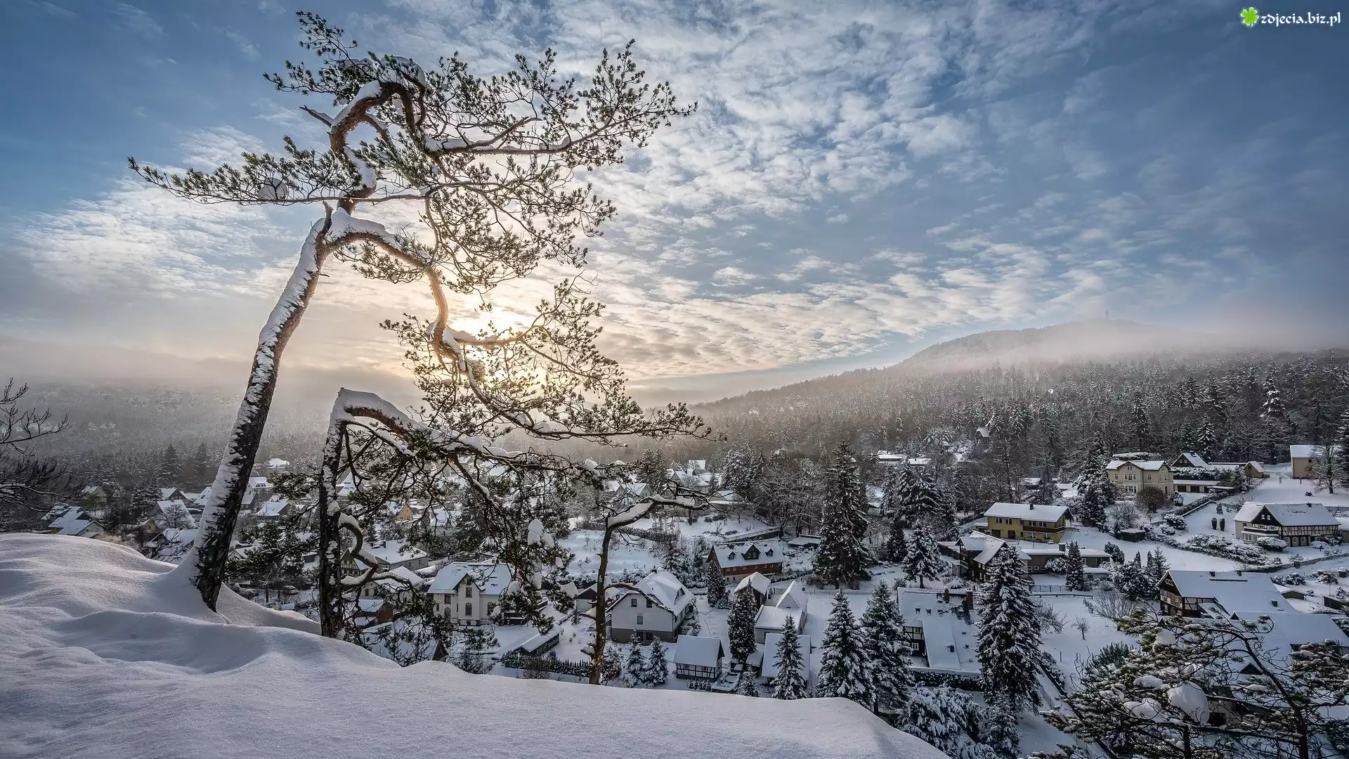 Zdjęcie Zima, Góry, Mgła, Domy, Drzewa, Śnieg, Miejscowość, Oybin, Saksonia, Niemcy