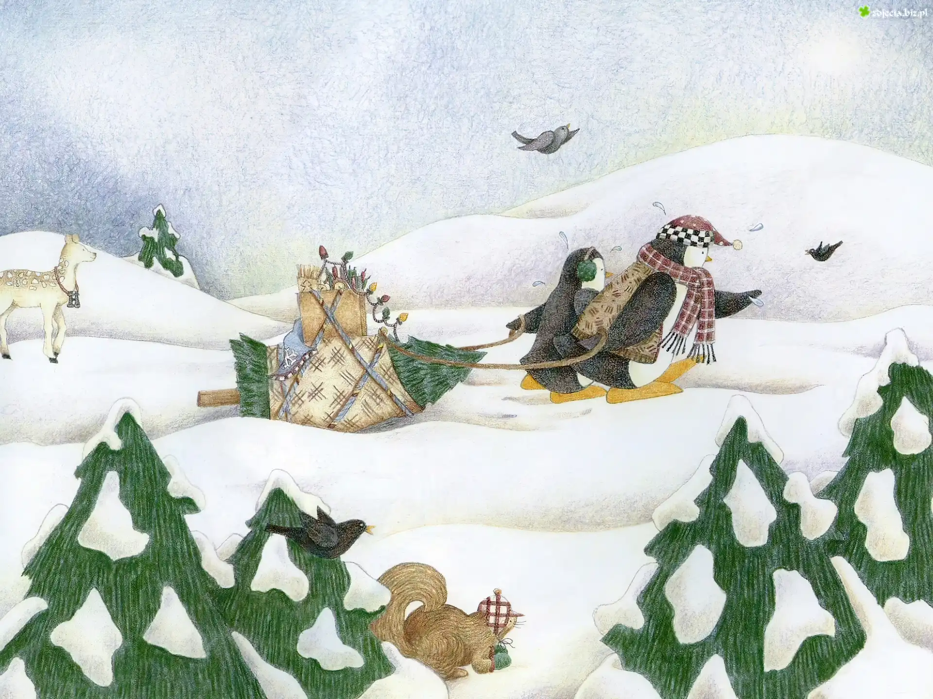 Zdjęcie Zima, Śnieg, Pingwiny, Sanie, Choinka