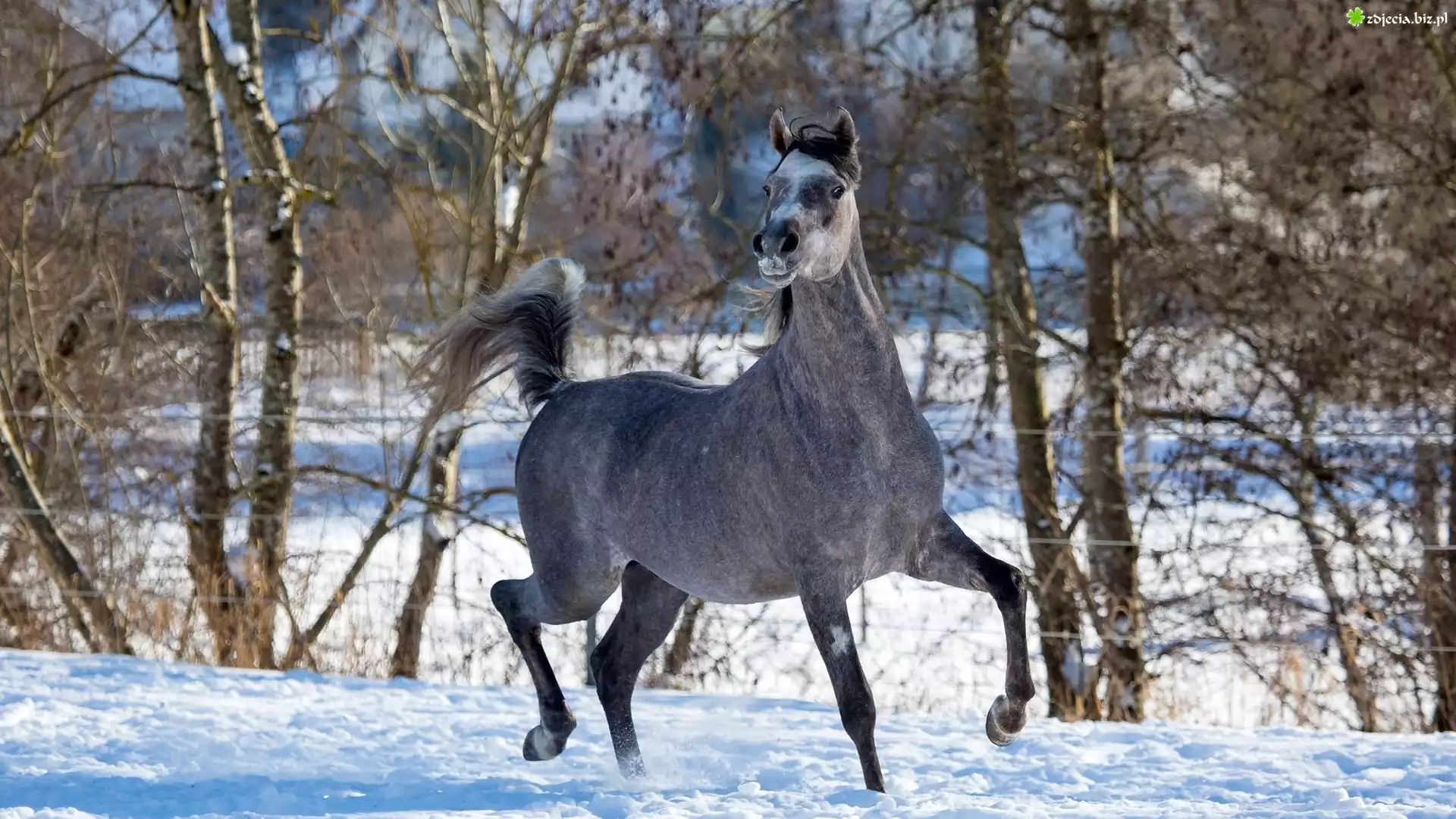 Zdjęcie Zima, Koń, Siwek, Drzewa