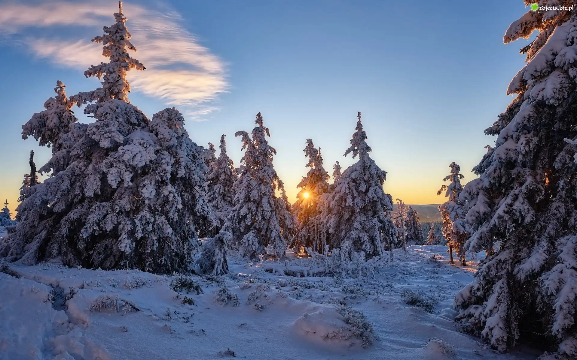 Zdjęcie Zima, Śnieg, Drzewa, Promienie słońca, Chmura