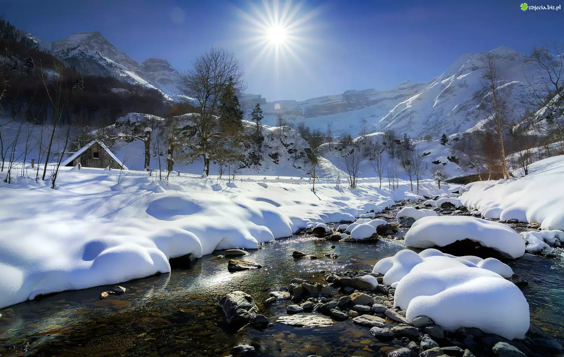 Zdjęcie Zima, Rzeka, Góry, Promienie słońca, Drzewa