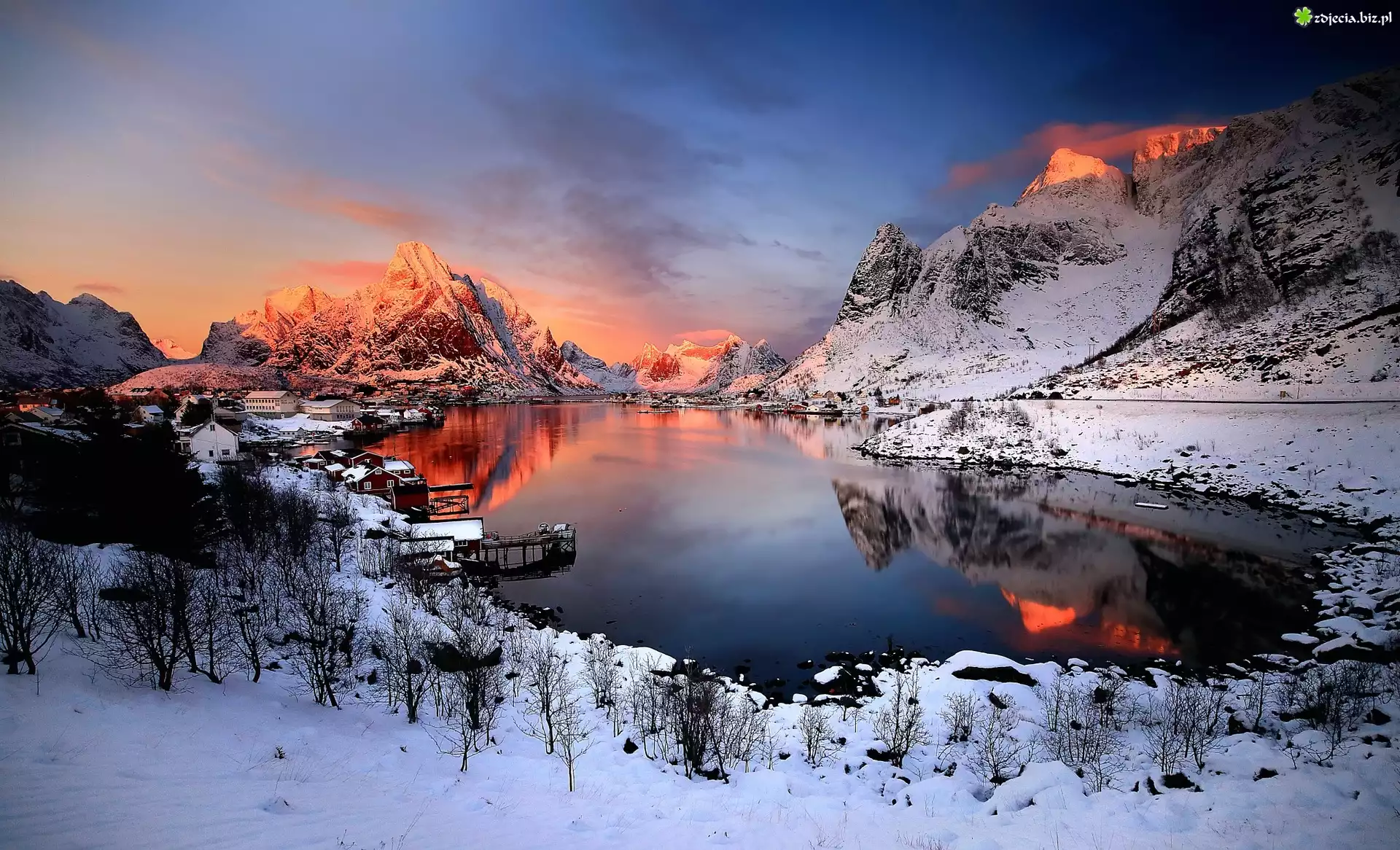 Zdjęcie Zima, Śnieg, Jezioro, Zachód Słońca, Góry