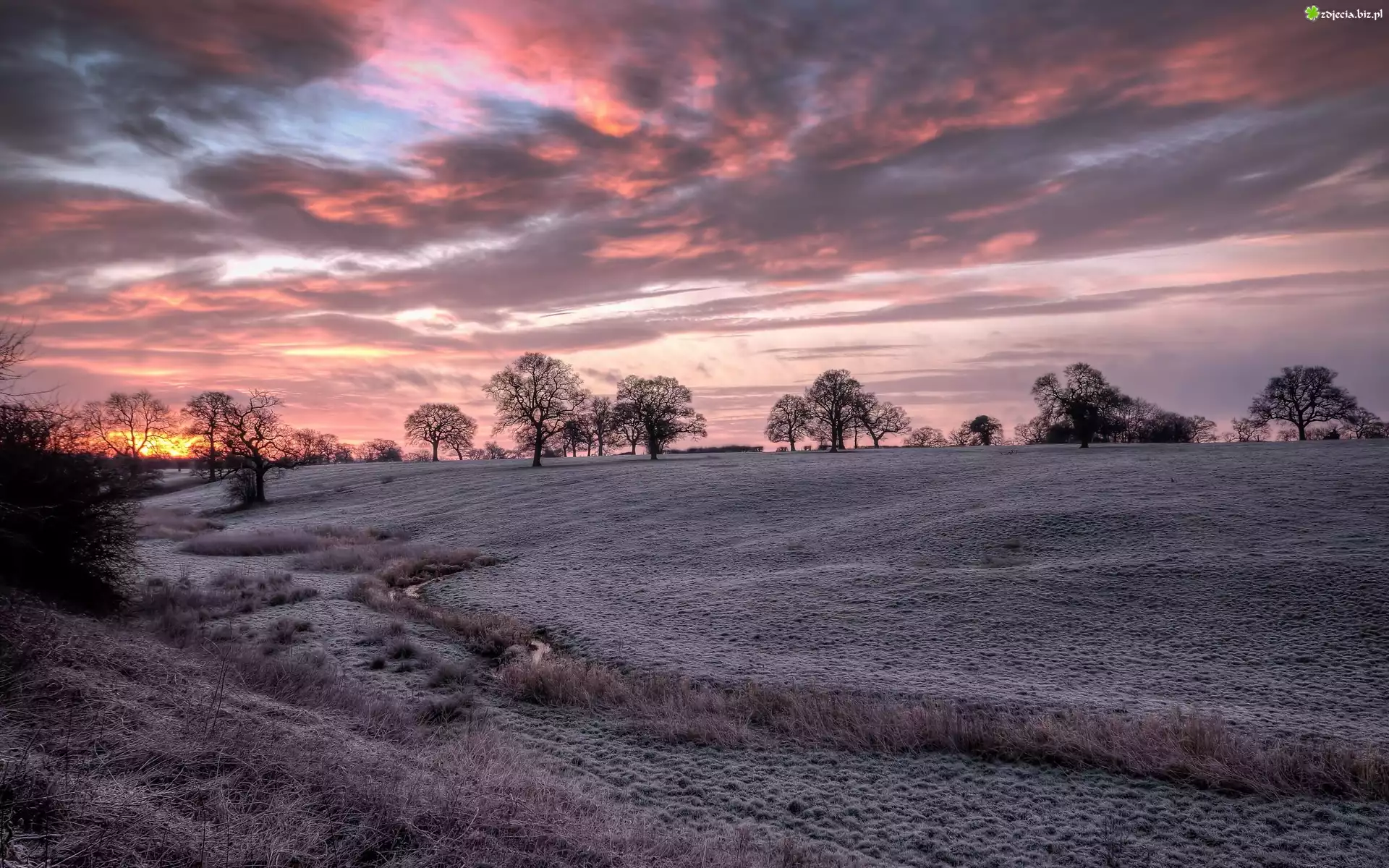 Zdjęcie Zima, Ośnieżone, Pole, Zachód, Słońca, Chmury