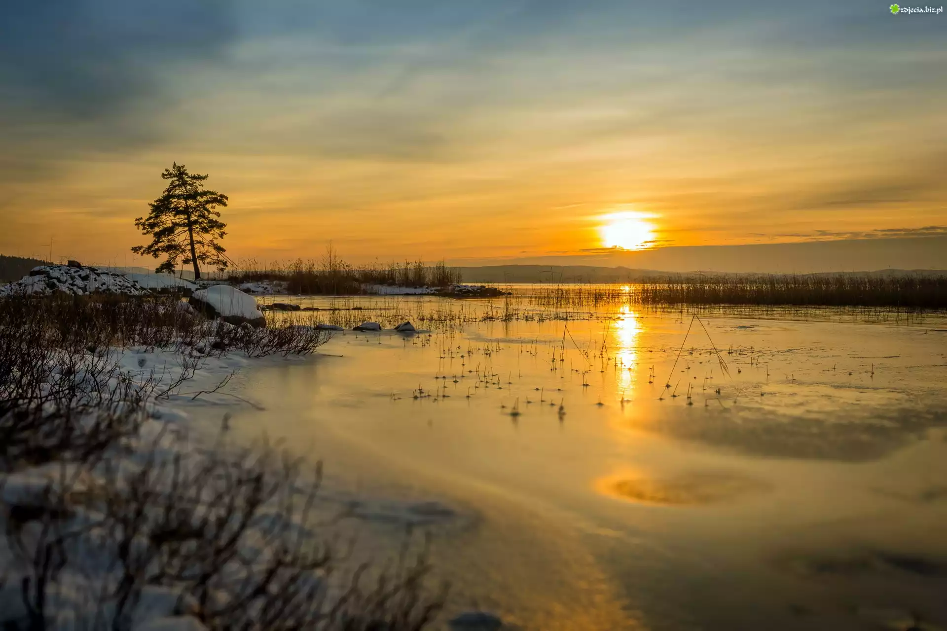 Zdjęcie, Zima, Jezioro Glafsfjorden, Wschód słońca, Drzewo, Szwecja