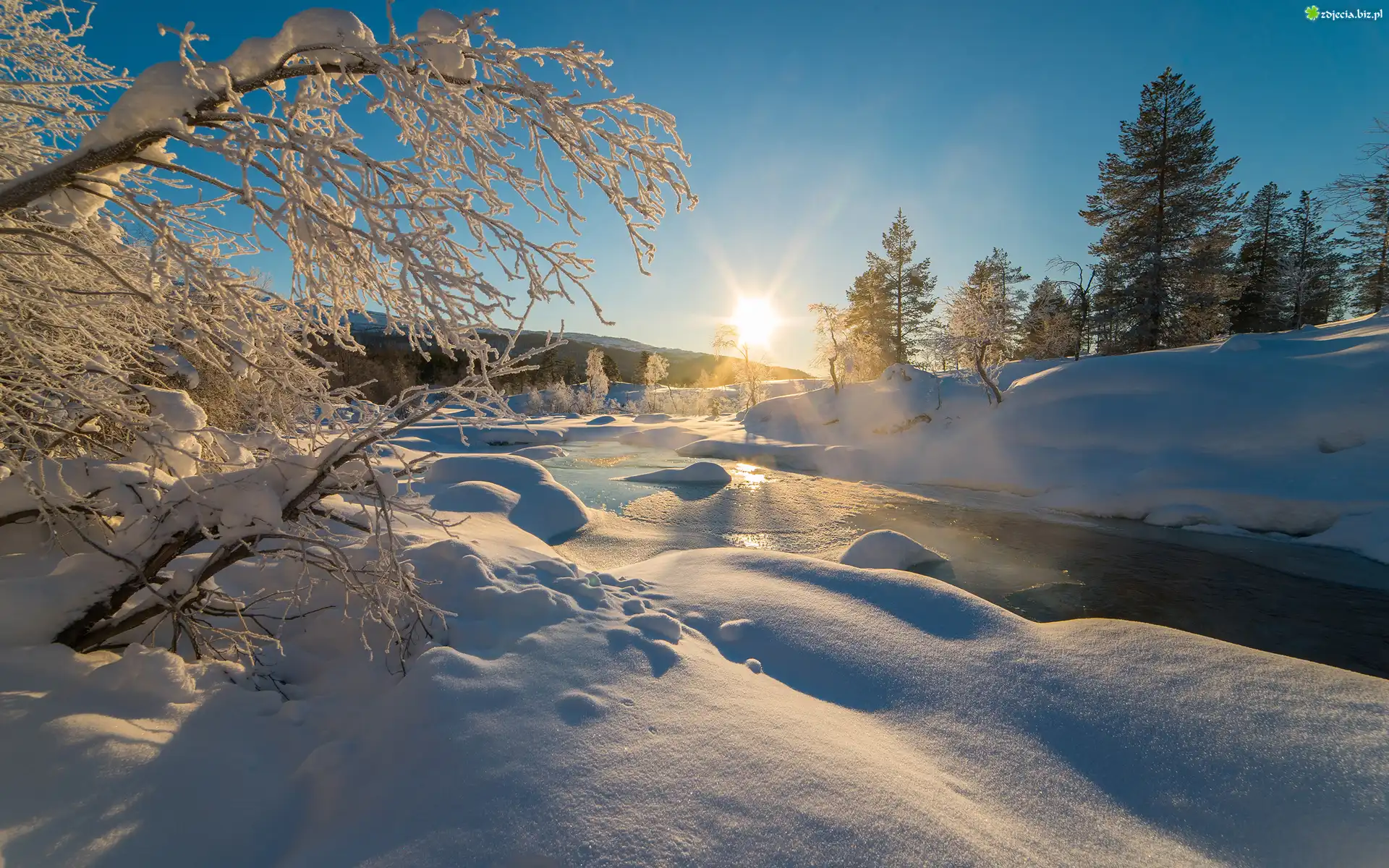 Zdjęcie Zima, Rzeka, Wschód słońca, Drzewa
