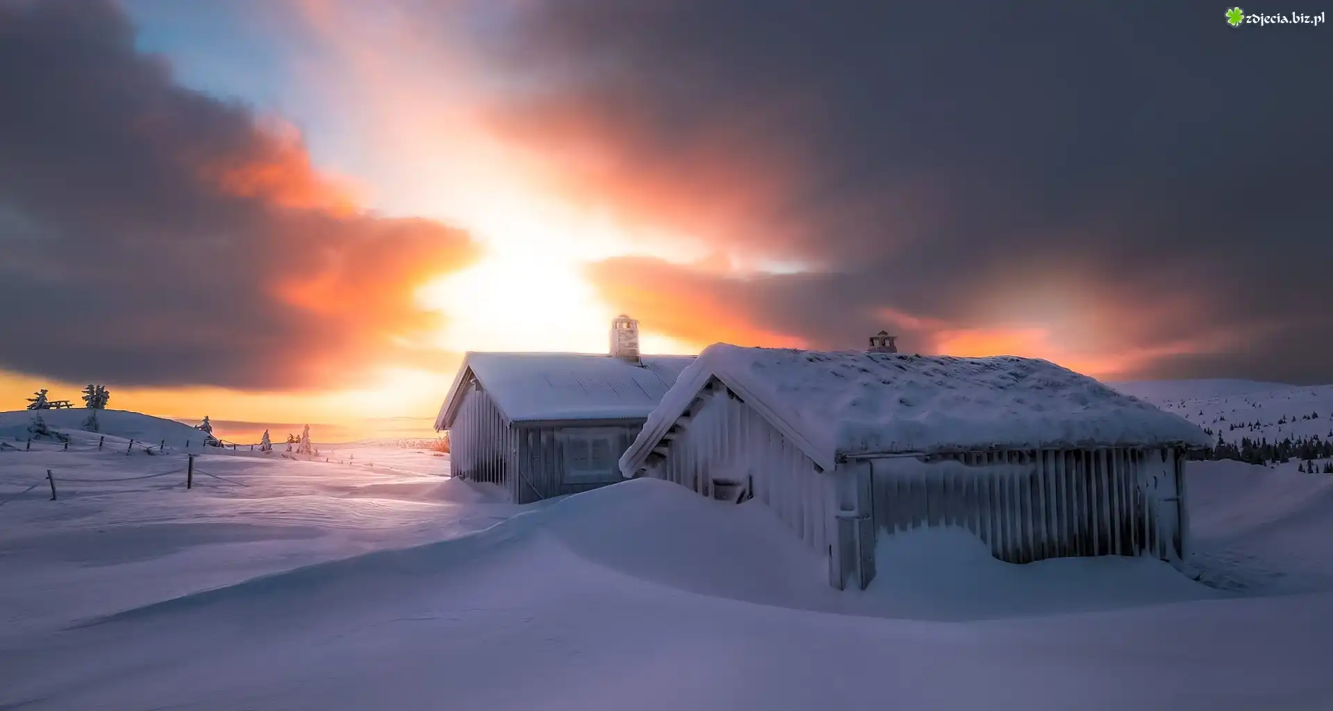 Zdjęcie Zima, Domy, Zachód słońca, Mgła
