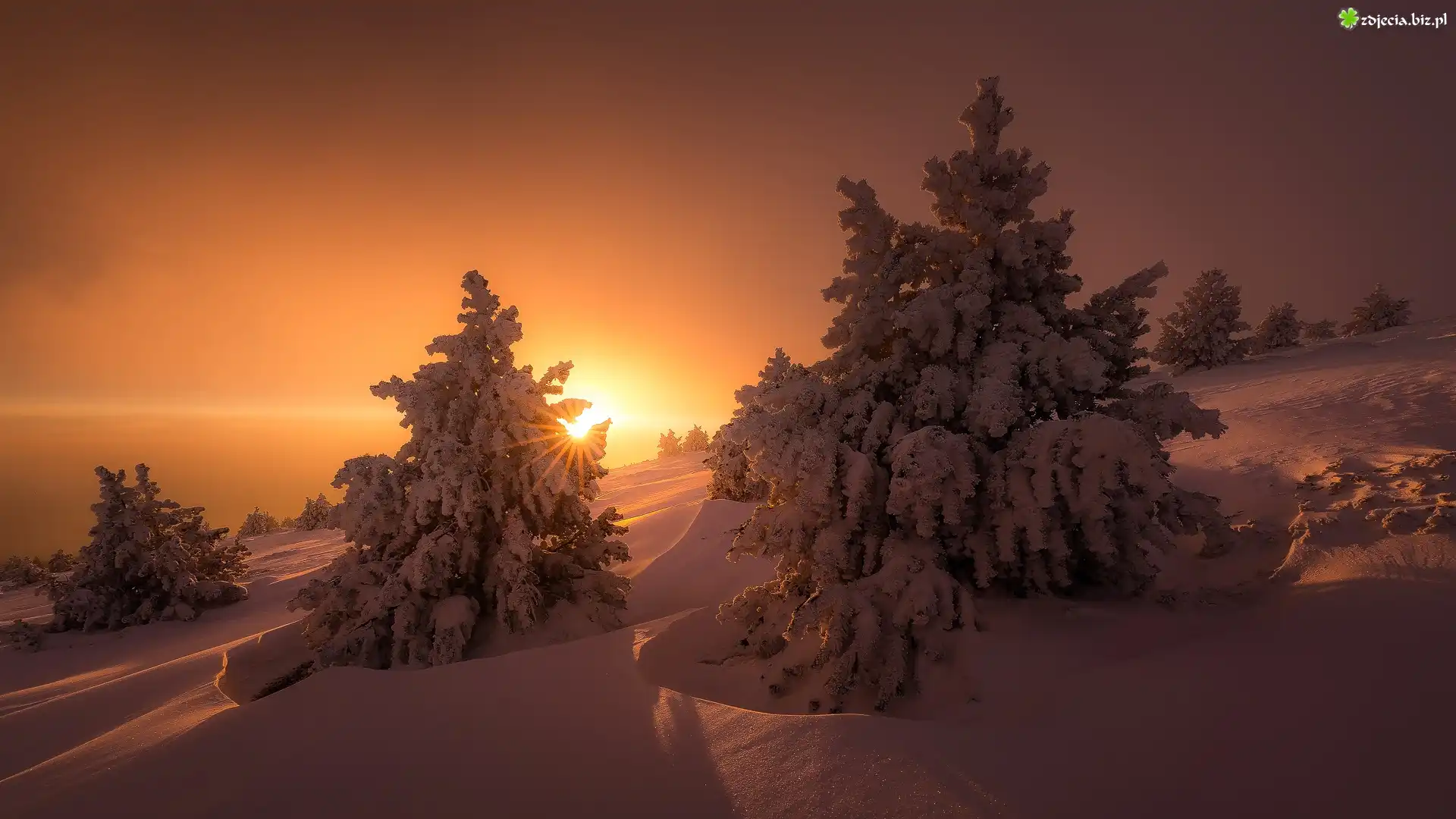 Zdjęcie Zima, Śnieg, Zachód słońca, Świerki
