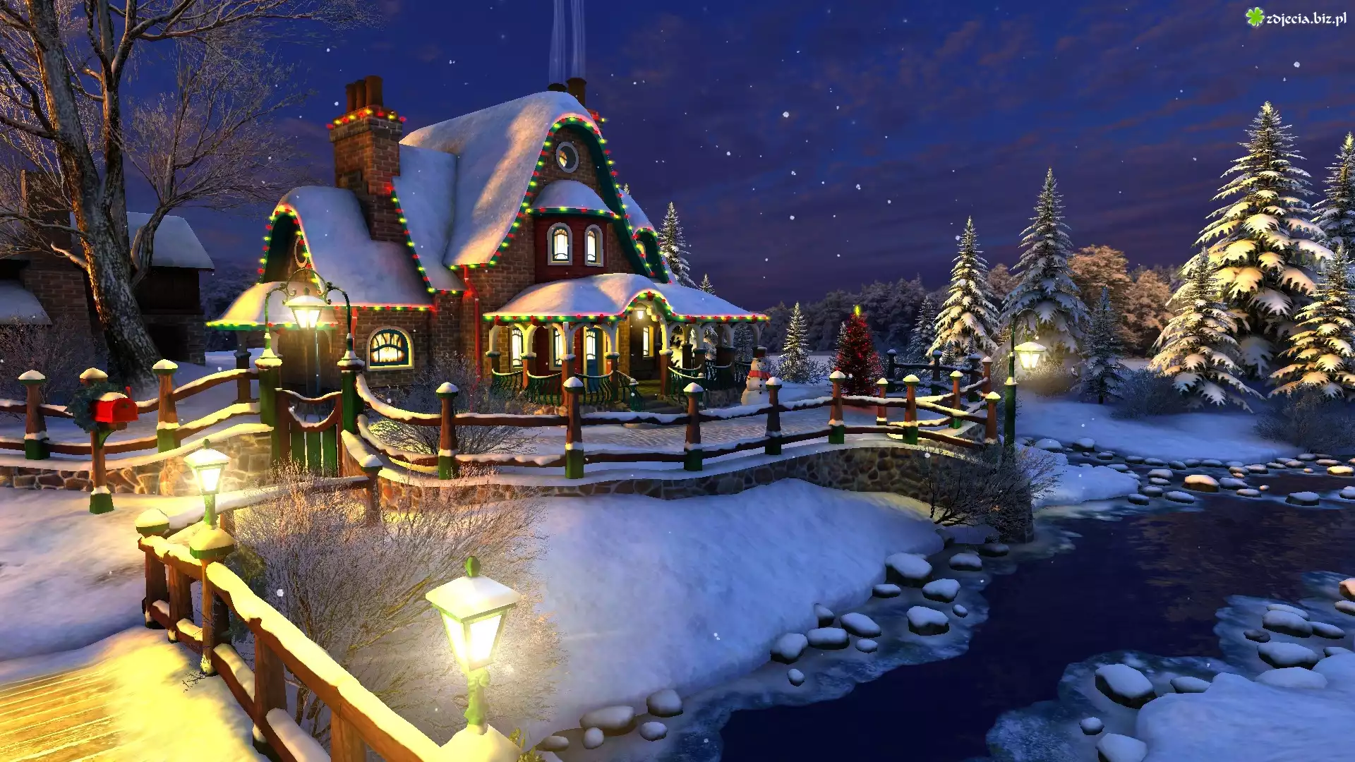 Zdjęcie Dom, Oświetlenie, Śnieg, Zima, Choinki, Latarnie, 2D