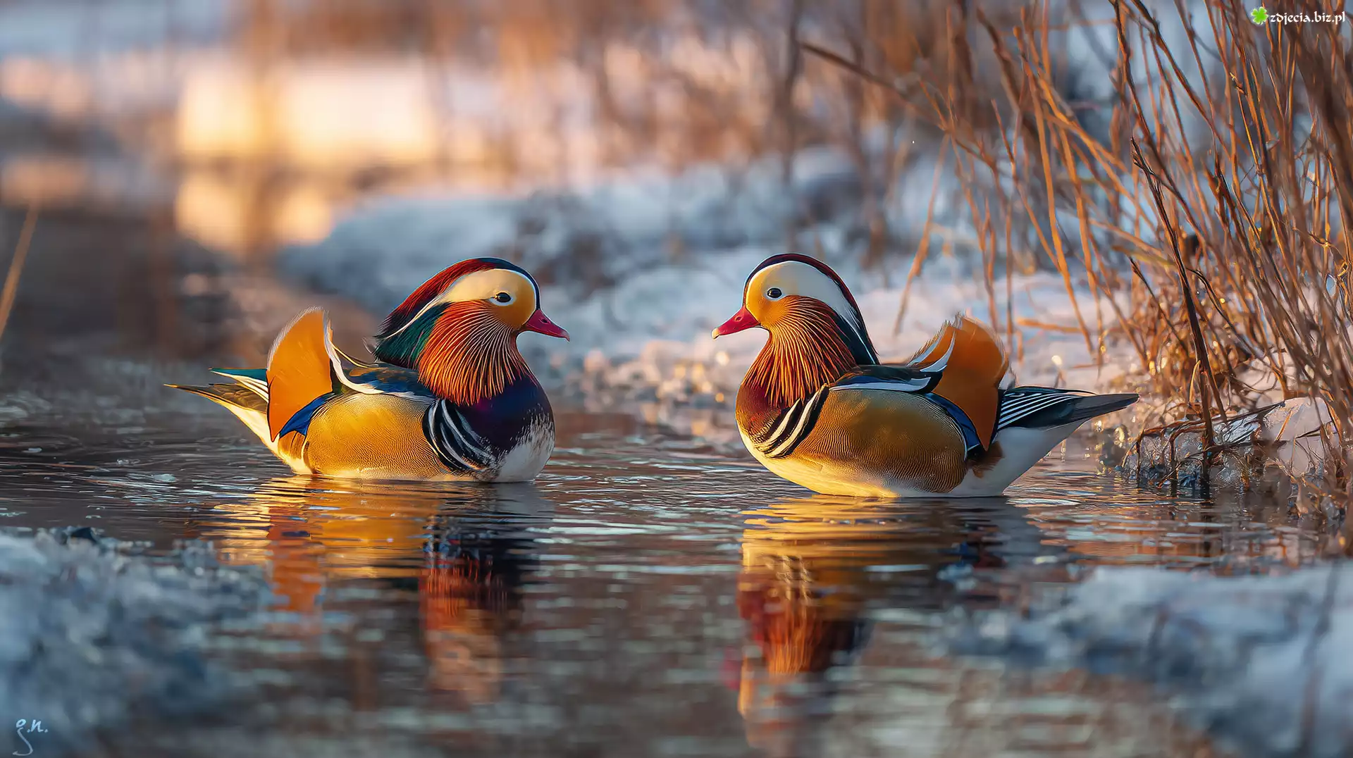 Zdjęcie Kaczki, Mandarynki, Staw, Zima, Zarośla, Grafika ai