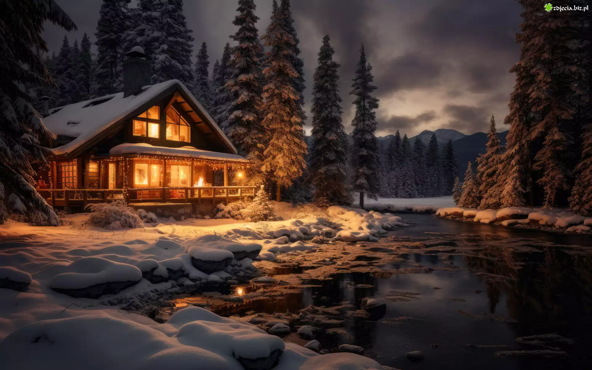 Zdjęcie Zima, Las, Dom, Rzeka, Kamienie, Drzewa, Śnieg, Noc, Światła, Chmury