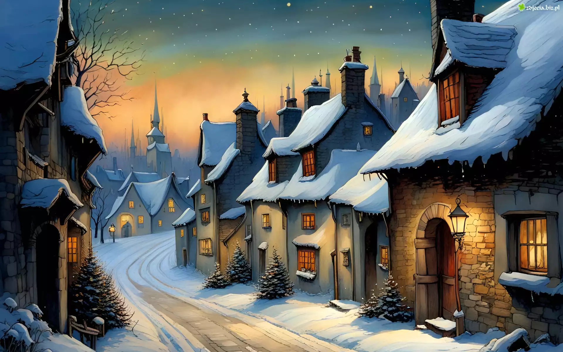 Zdjęcie Zima, Domy, Uliczka, Drzewka, Choinki, Latarnie, Światła, Śnieg, Niebo