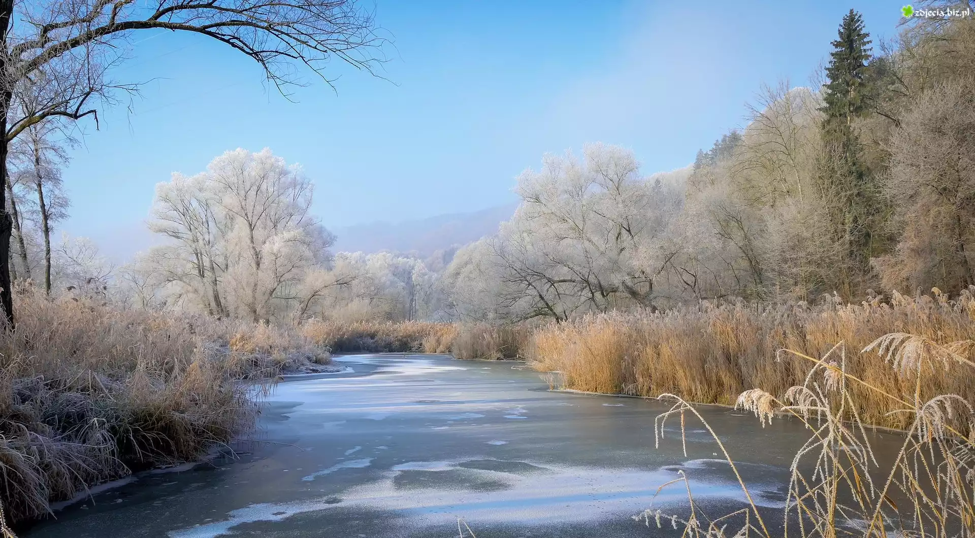 Zdjęcie Zima, Rzeka, Drzewa, Trawa, Szron
