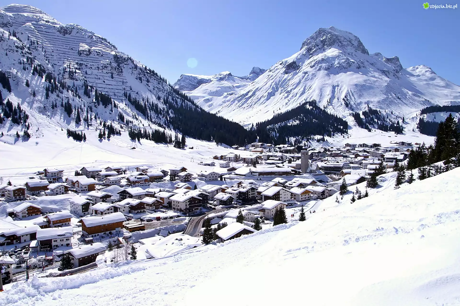 Zdjęcie Tyrol, Zima, Góry, Las, Dolina, Panorama, Kurortu