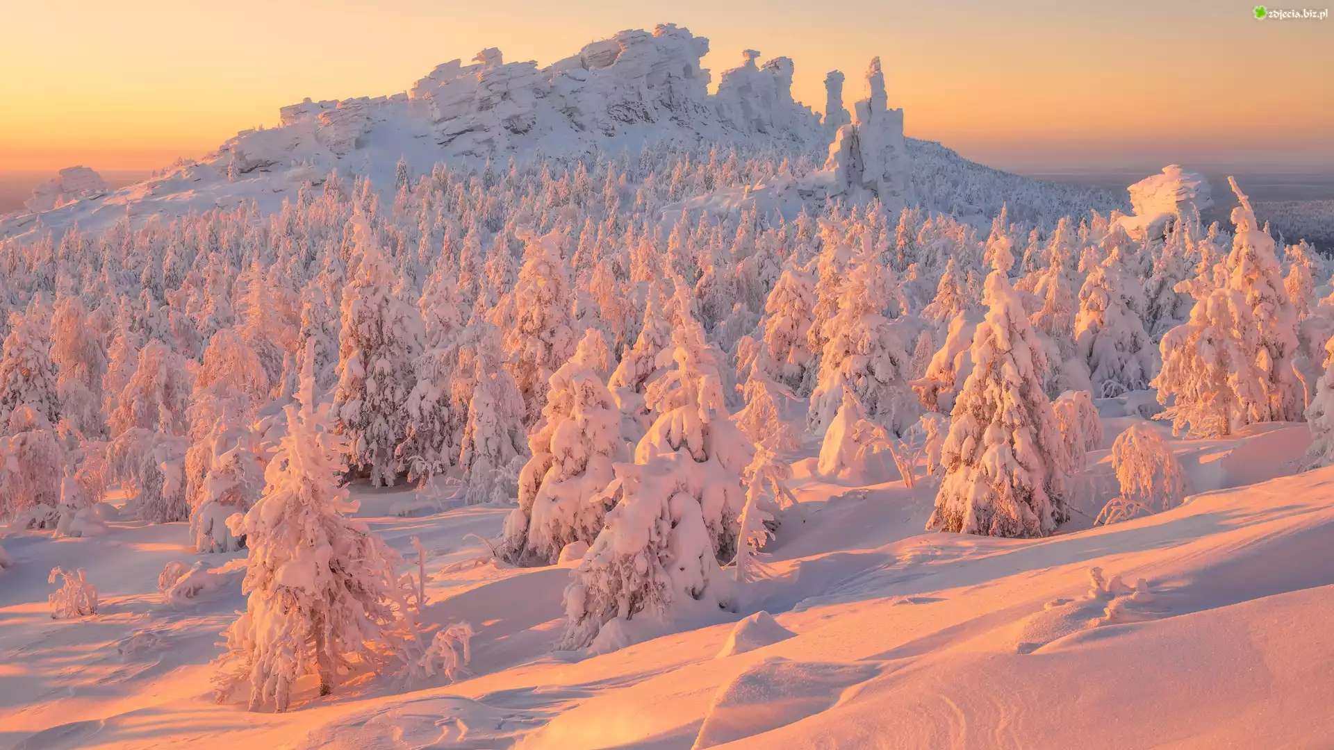Zdjęcie Zima, Drzewa, Świerki, Ośnieżone, Zaspy, Wschód słońca, Góry, Ural, Rosja