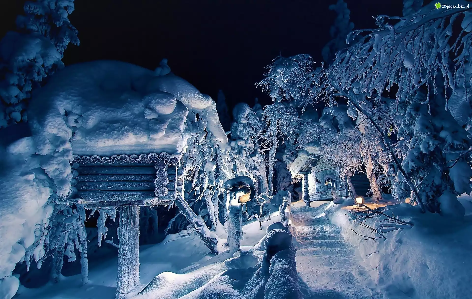Zdjęcie Zima, Drzewa, Domki, Światła, Noc