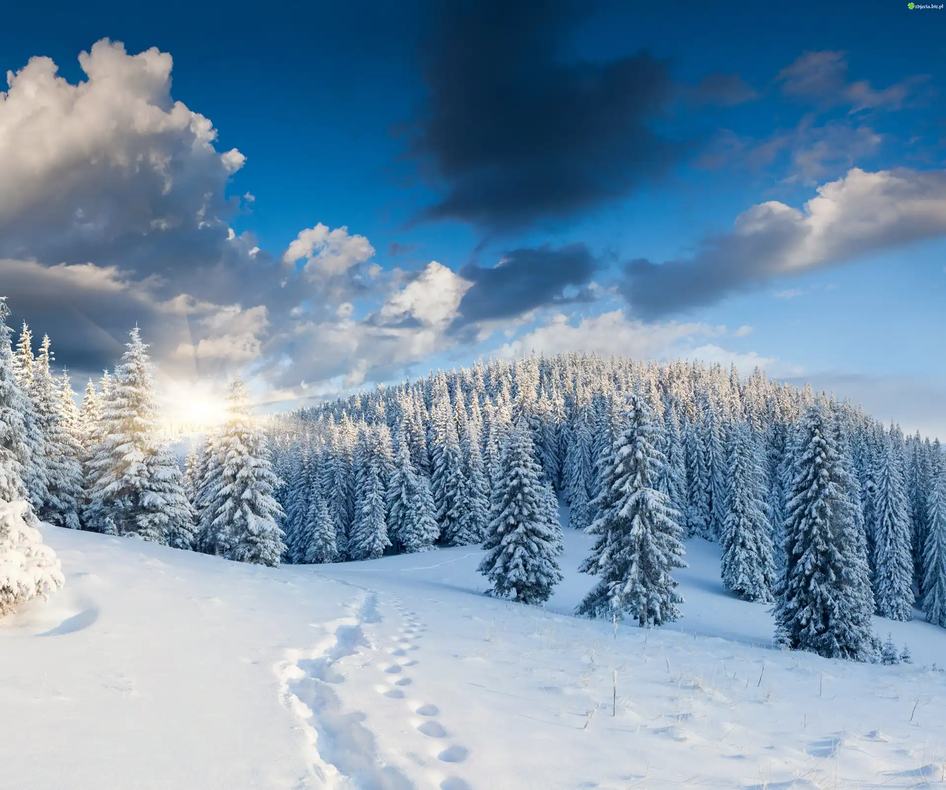 Zdjęcie Zima, Śnieg, Las, Świerki, Słońce