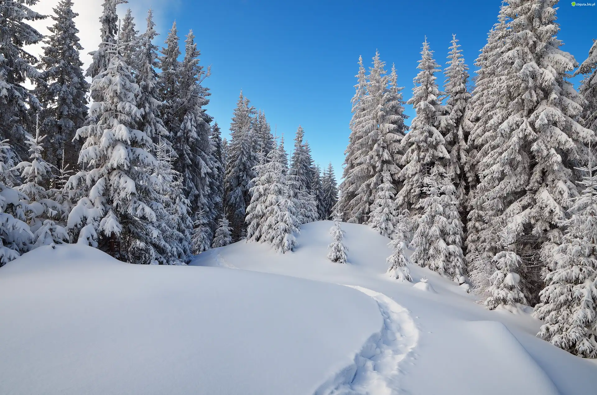 Zdjęcie, Zima, Śnieg, Świerki, Ścieżka