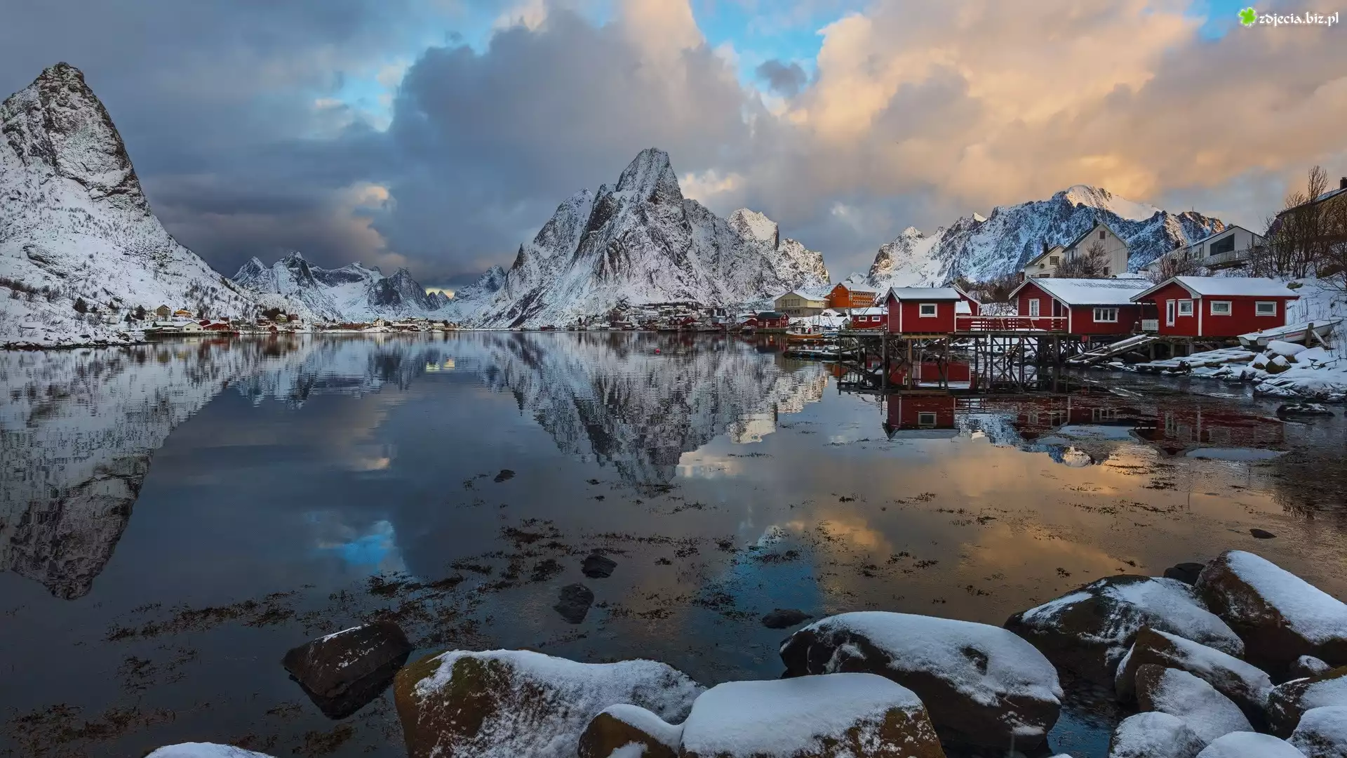 Zdjęcie Norwegia, Lofoty, Wioska Reine, Czerwone, Domki, Góry, Chmury, Zima