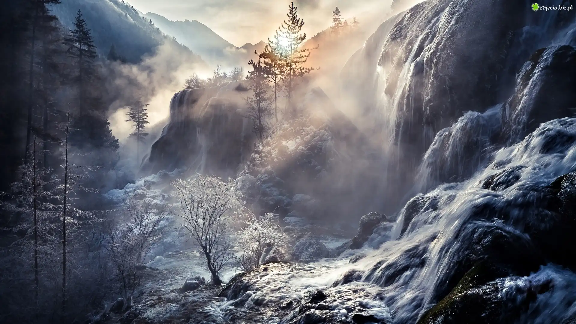 Zdjęcie, Zima, Wschód słońca, Góry, Wodospad, Mgła