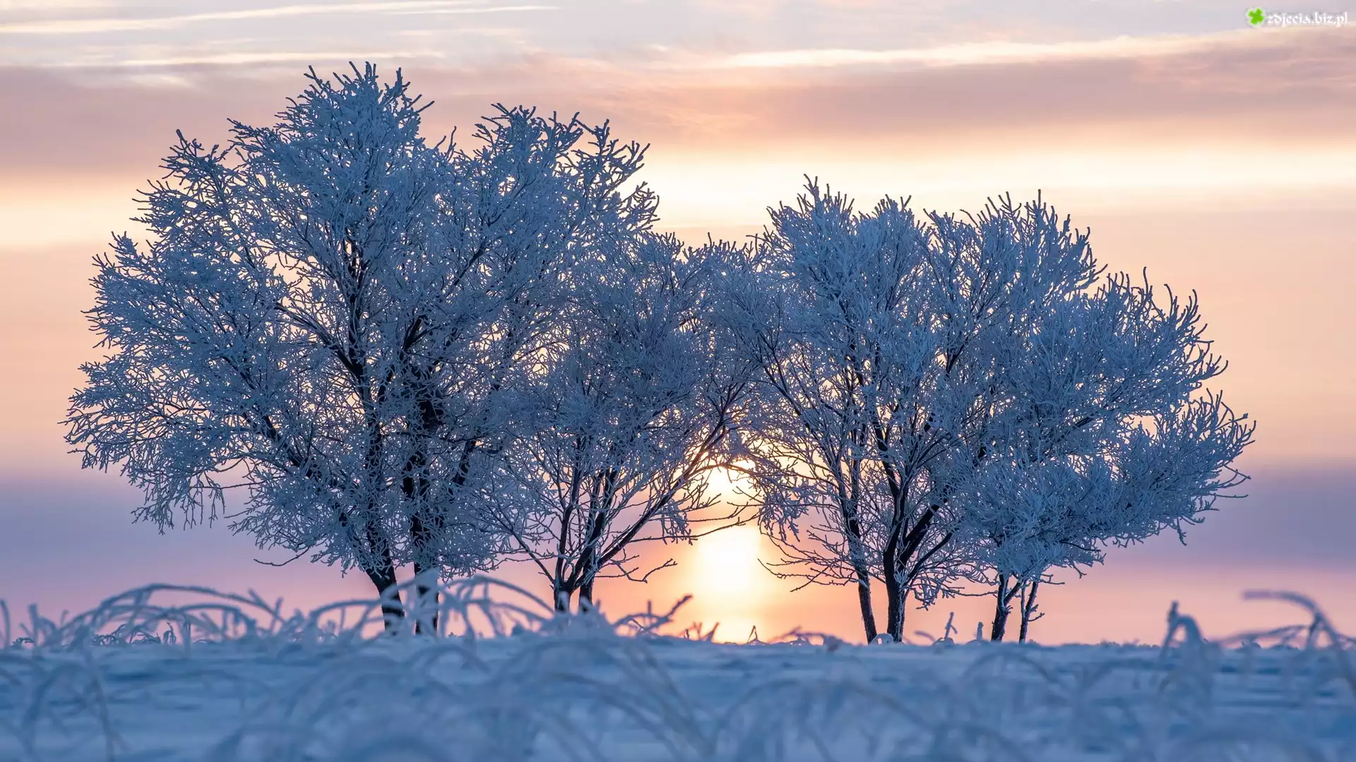 Zdjęcie Zima, Oszronione, Drzewa, Wschód słońca
