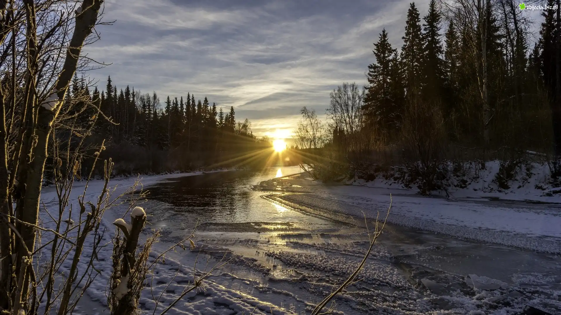 Zdjęcie Zima, Rzeka, Drzewa, Wschód słońca