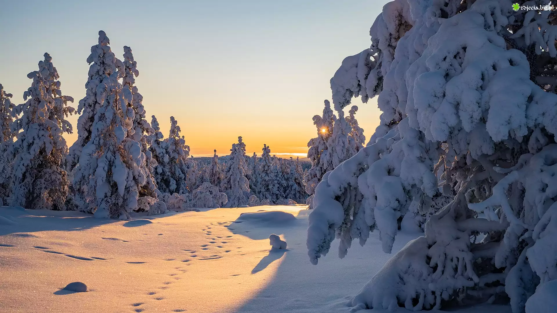 Zdjęcie Zima, Ośnieżone, Drzewa, Świerki, Wschód słońca