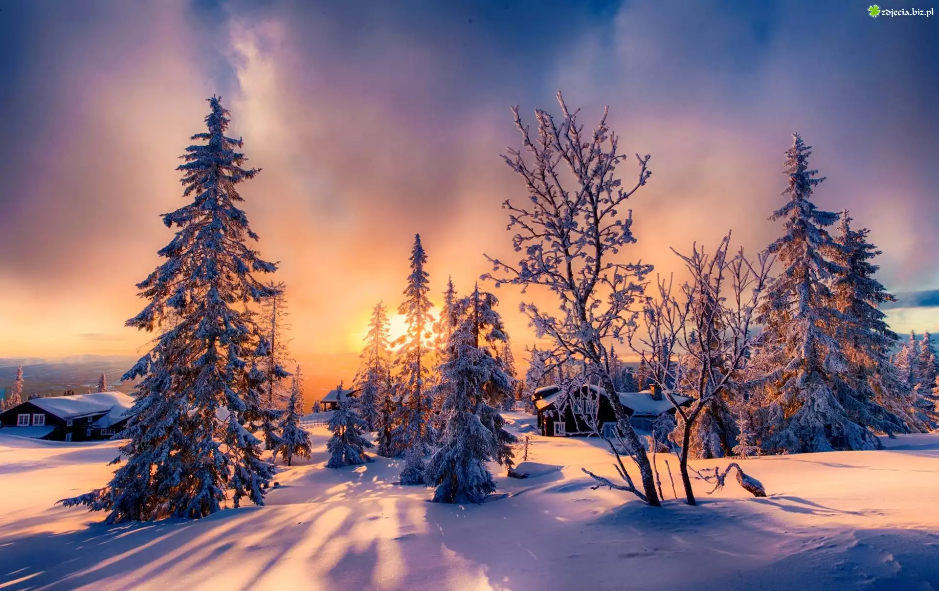 Zdjęcie Zima, Domy, Wieś, Wschód słońca