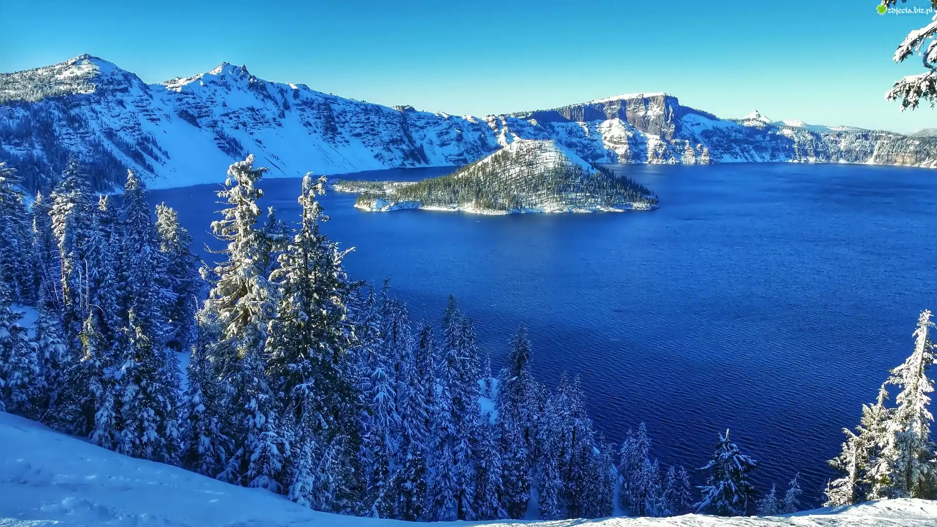 Zdjęcie Zima, Góry, Jezioro, Wysepka, Las