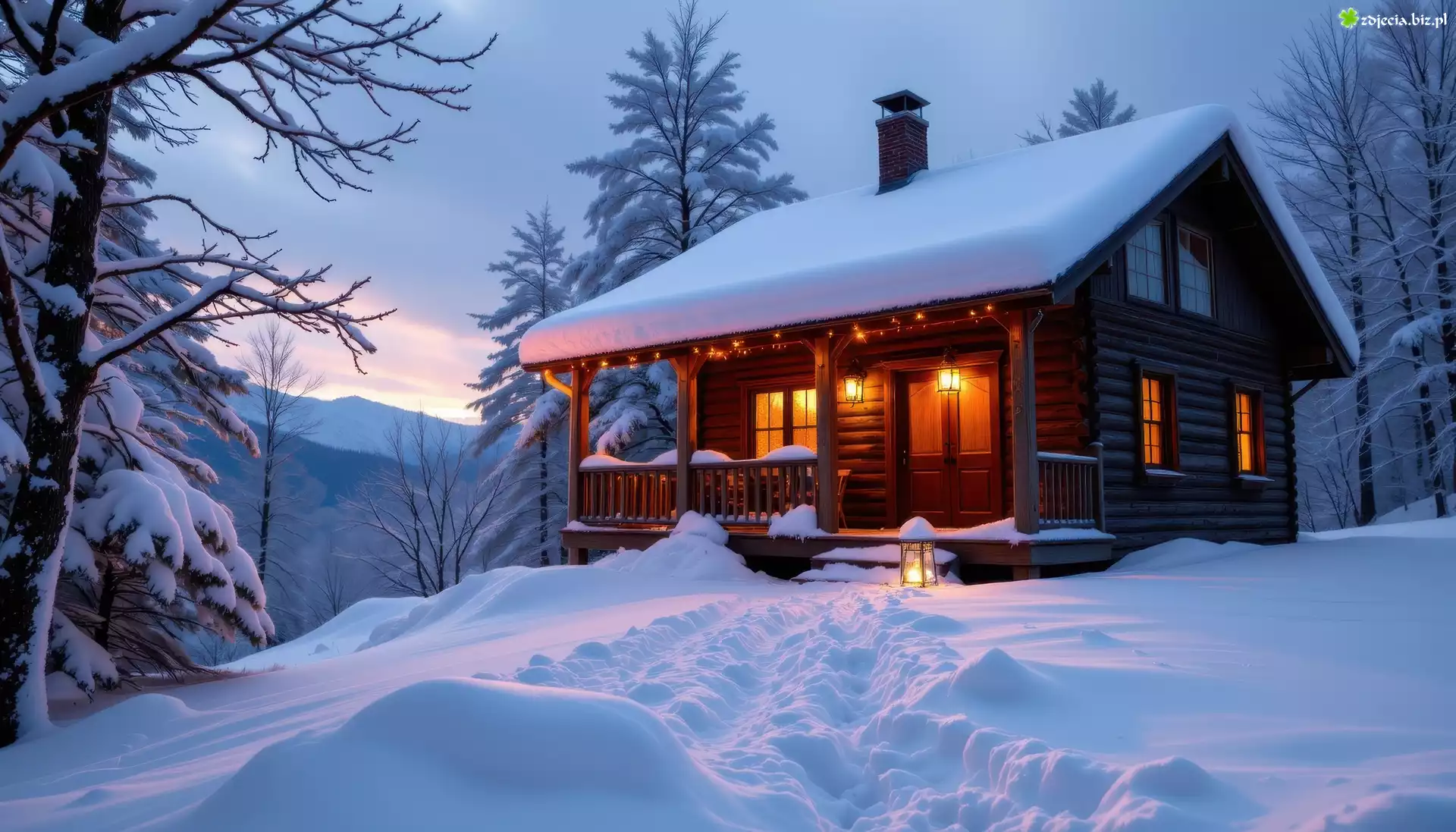 Zdjęcie Dom, Oświetlony, Wzgórze, Zima, Śnieg, Drzewa, AI