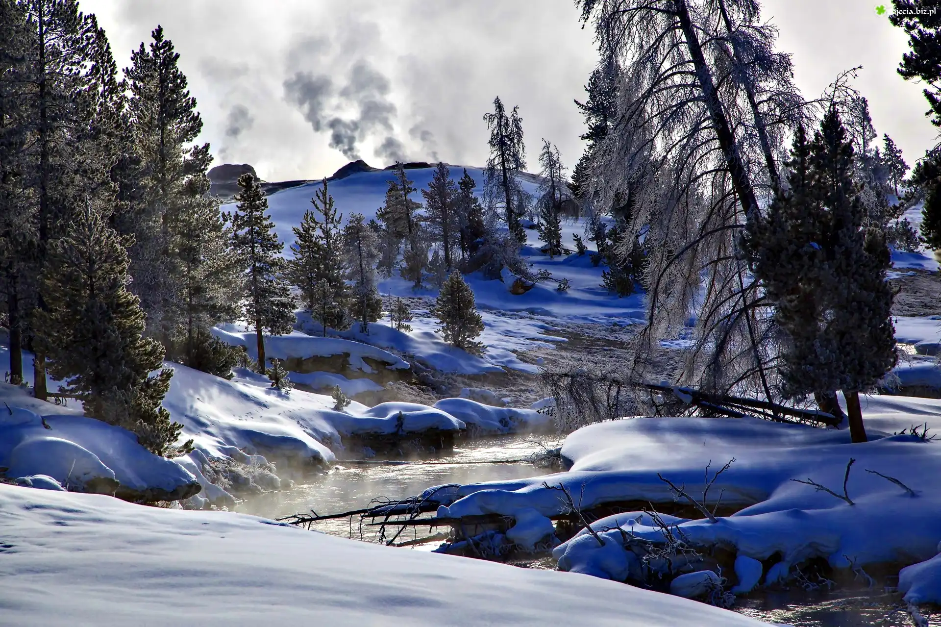 Zdjęcie Stany Zjednoczone, Stan Wyoming, Park Narodowy Yellowstone, Rzeka Firehole River, Zima, Drzewa |