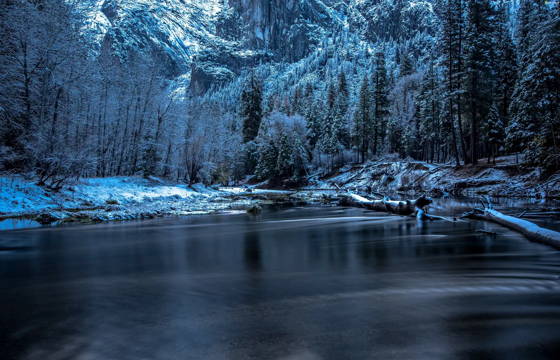 Zdjęcie, Stany Zjednoczone, Stan Kalifornia, Park Narodowy Yosemite, Zima, Góry, Rzeka, Drzewa