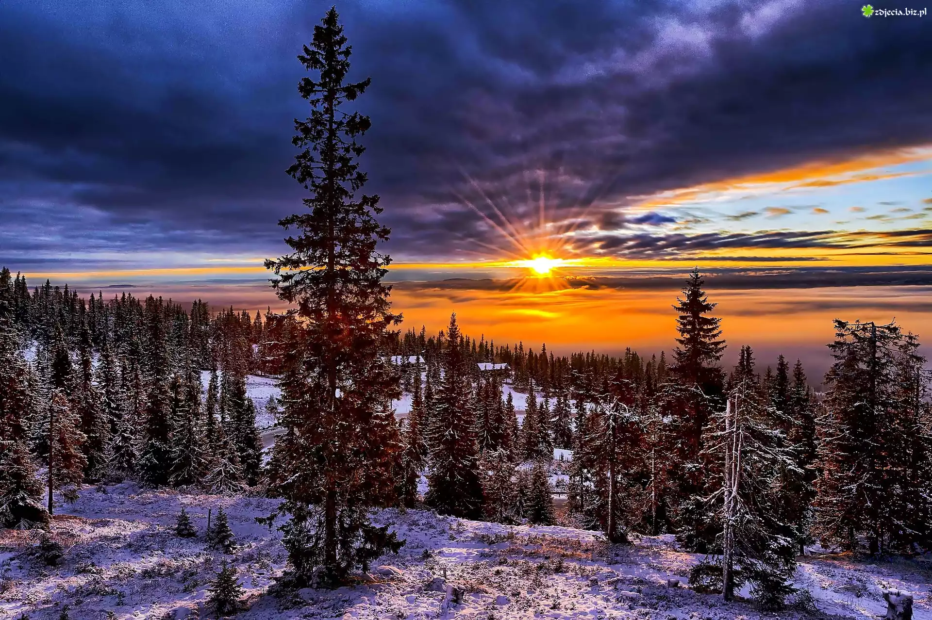 Zdjęcie Zima, Las, Chmury, Promienie, Zachód słońca