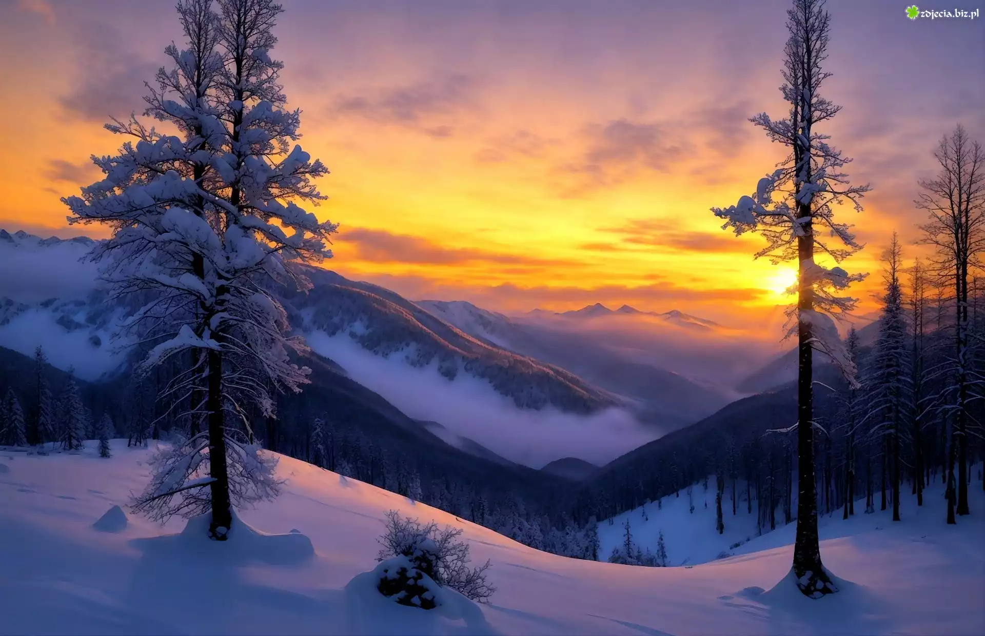 Zdjęcie Zima, Drzewa, Wzgórza, Mgła, Śnieg, Niebo, Zachód słońca, Góry