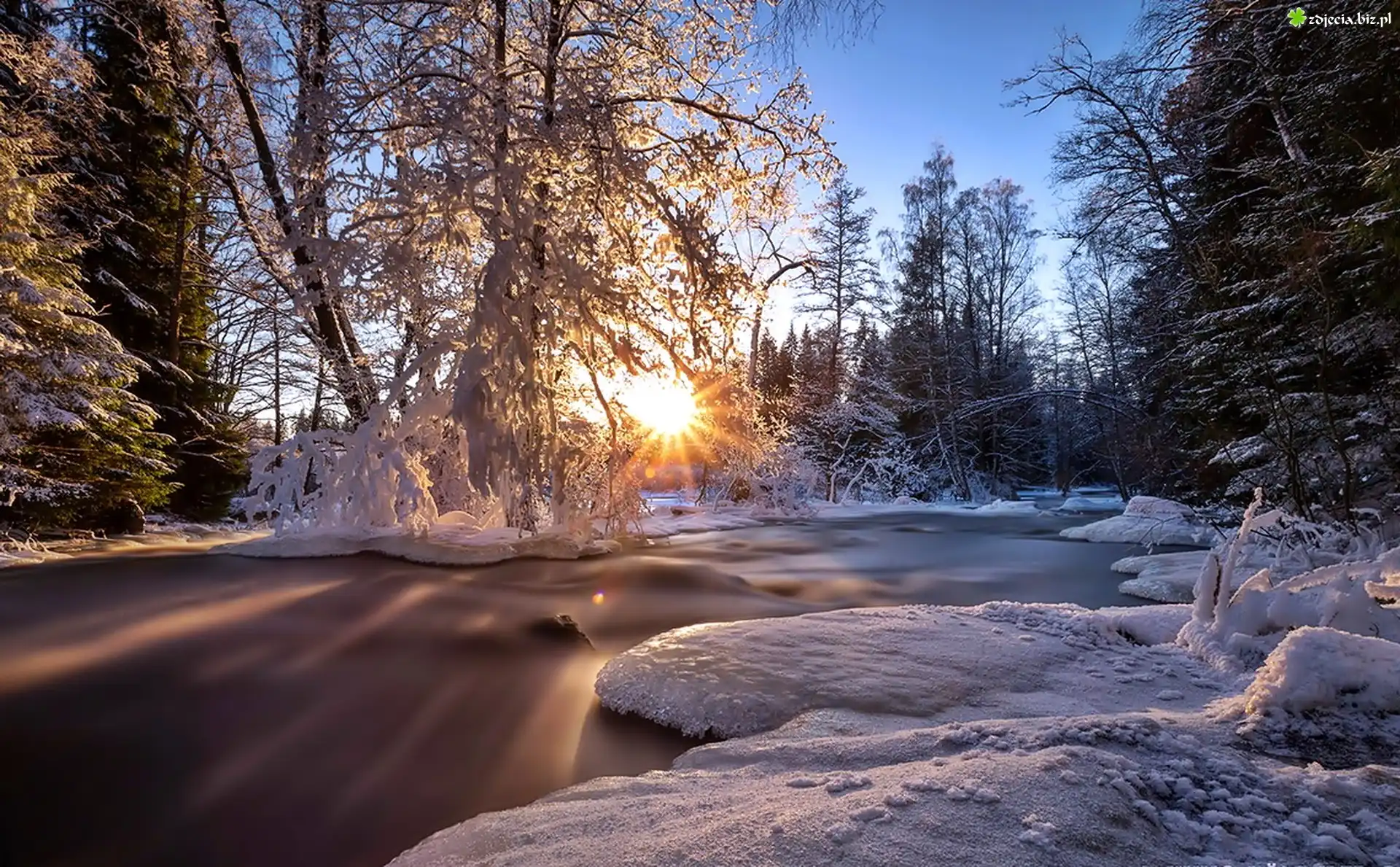 Zdjęcie Zima, Las, Promienie Słońca, Zamarznięta, Rzeka