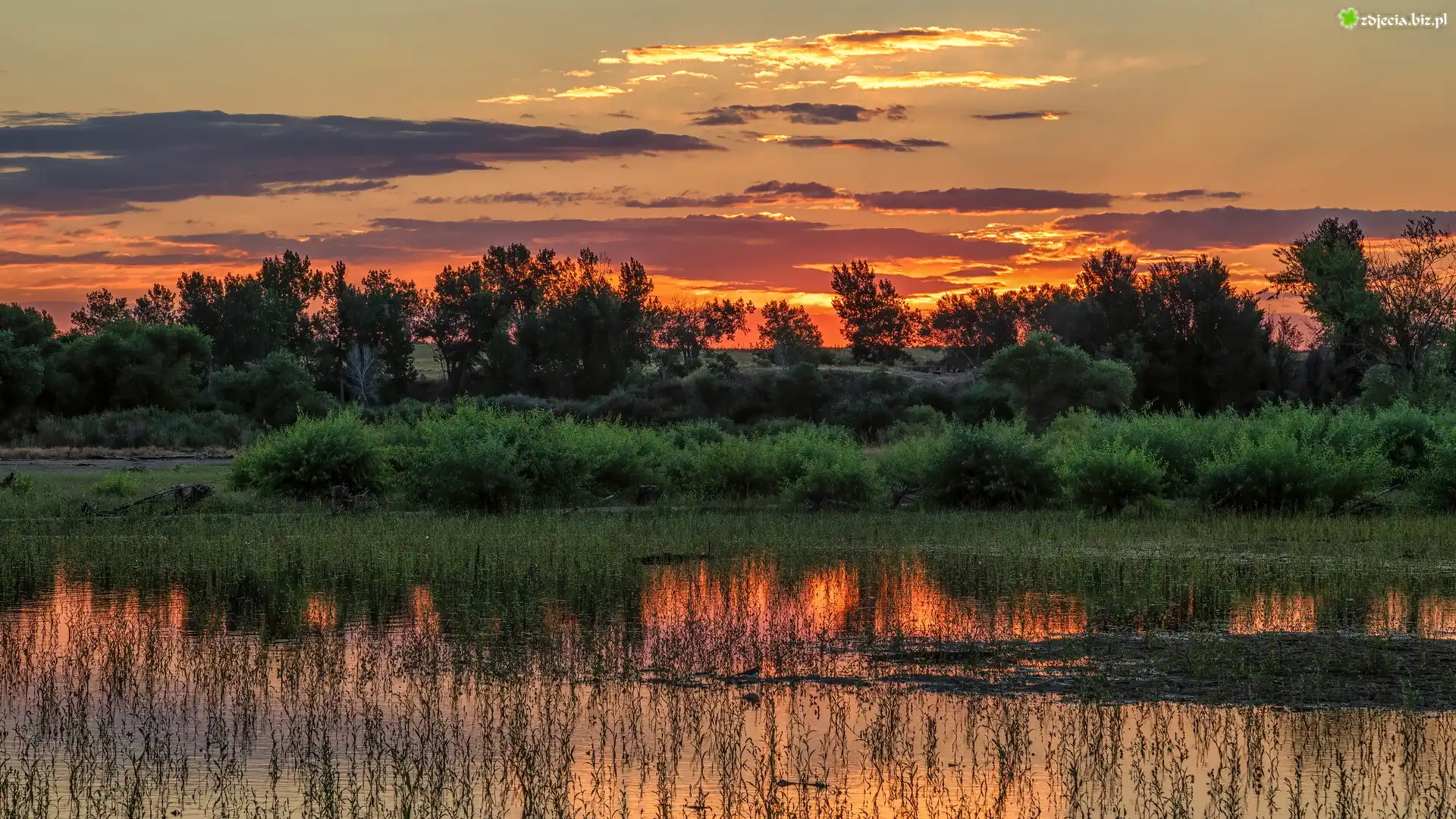 Zdjęcie Wschód słońca, Jezioro, Lake Chatfield, Trawy, Drzewa, Kolorado, Stany Zjednoczone