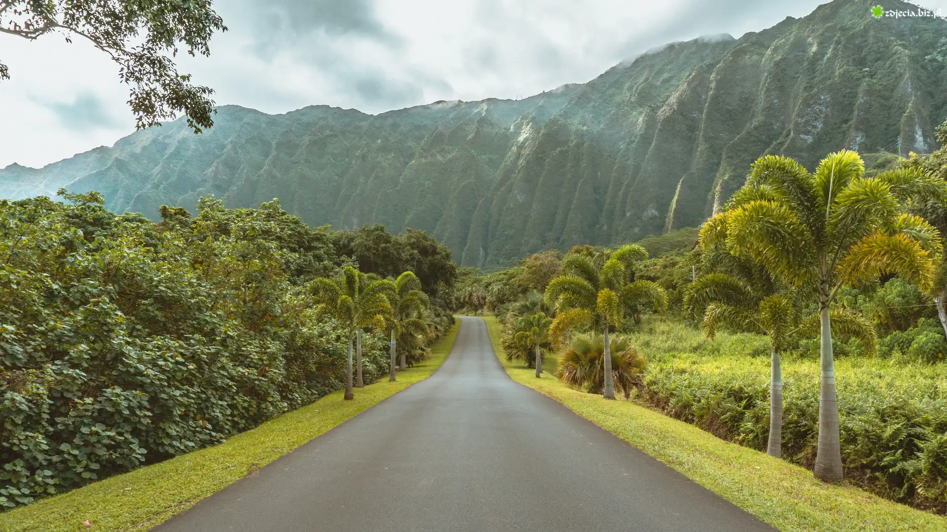 Zdjęcie Droga, Góry, Drzewa, Palmy, Wyspa Kauai, Hawaje, Stany Zjednoczone