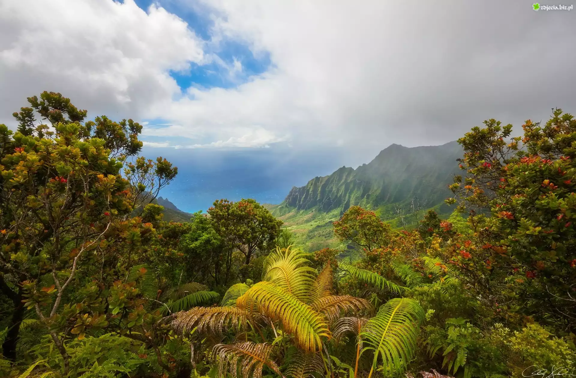 Zdjęcie, Stany Zjednoczone, Hawaje, Wyspa Kauai, Wzgórza, Chmury, Roślinność