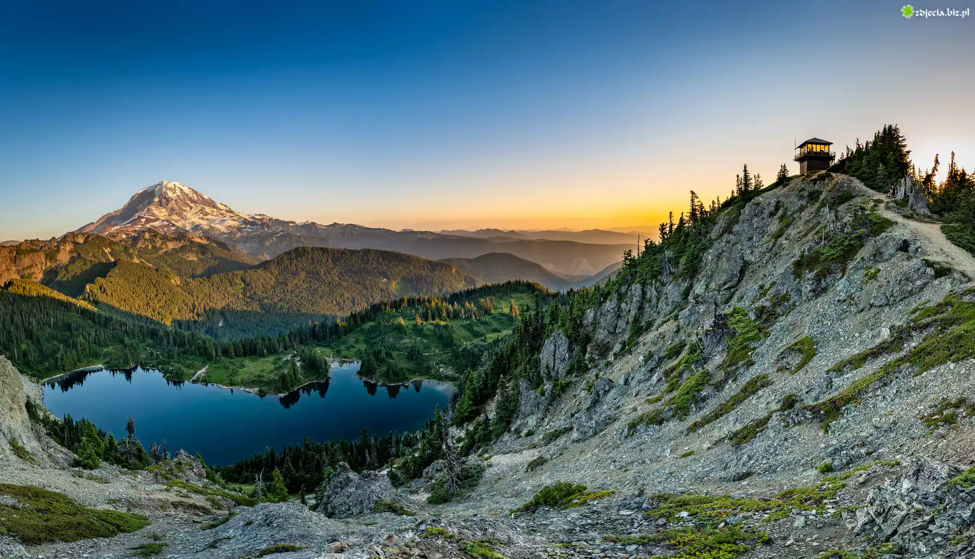 Zdjęcie Góra, Mount Rainier, Jezioro, Eunice Lake, Las, Skały, Wschód słońca, Park Narodowy Mount Rainier, Waszyngton, Stany Zjednoczone |