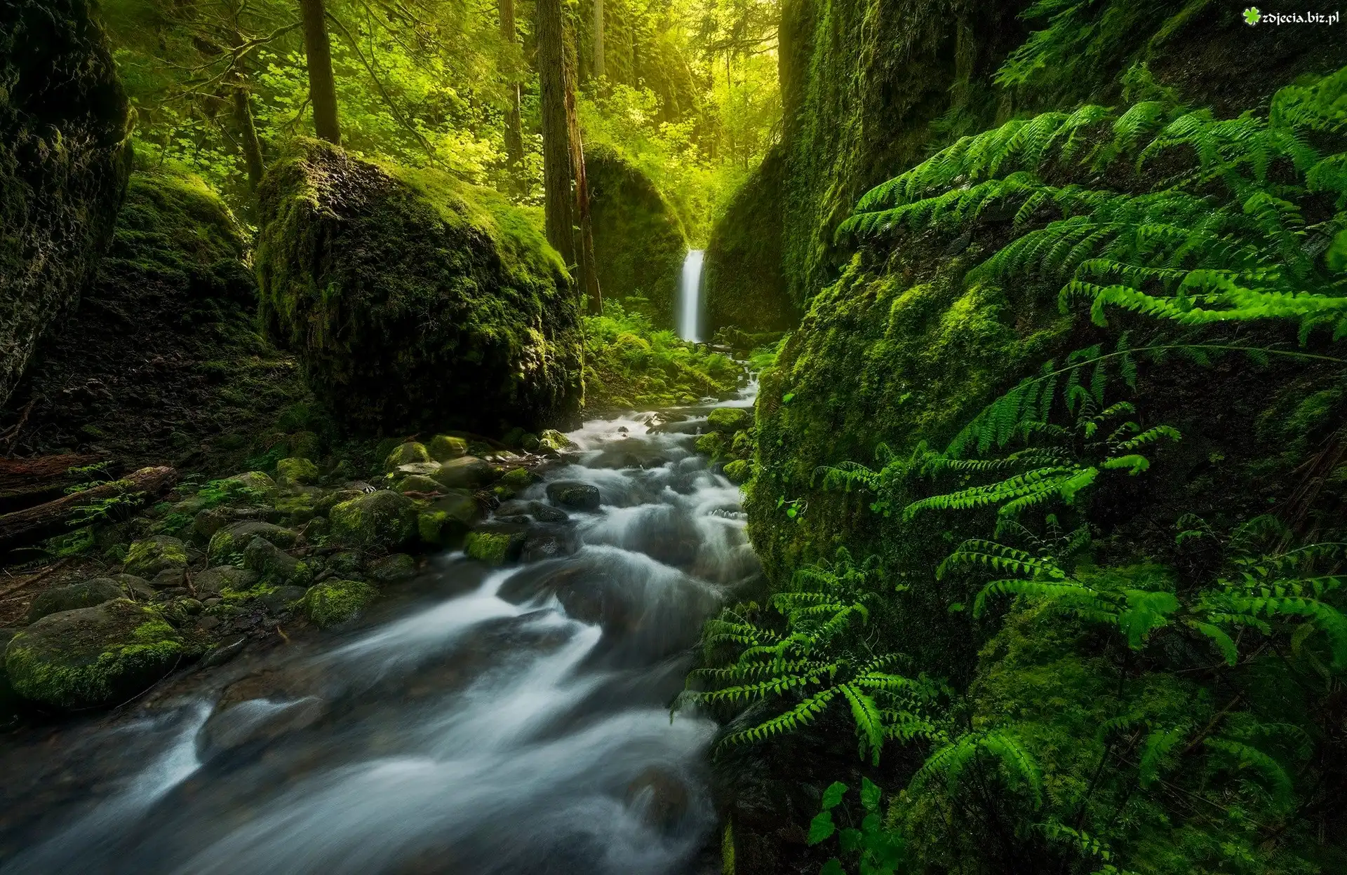 Zdjęcie Stany Zjednoczone, Stan Oregon, Rezerwat przyrody Columbia River Gorge, Rzeka Ruckel Creek, Wodospad Mossy Grotto Falls, Las, Omszałe, Kamienie, Skały |