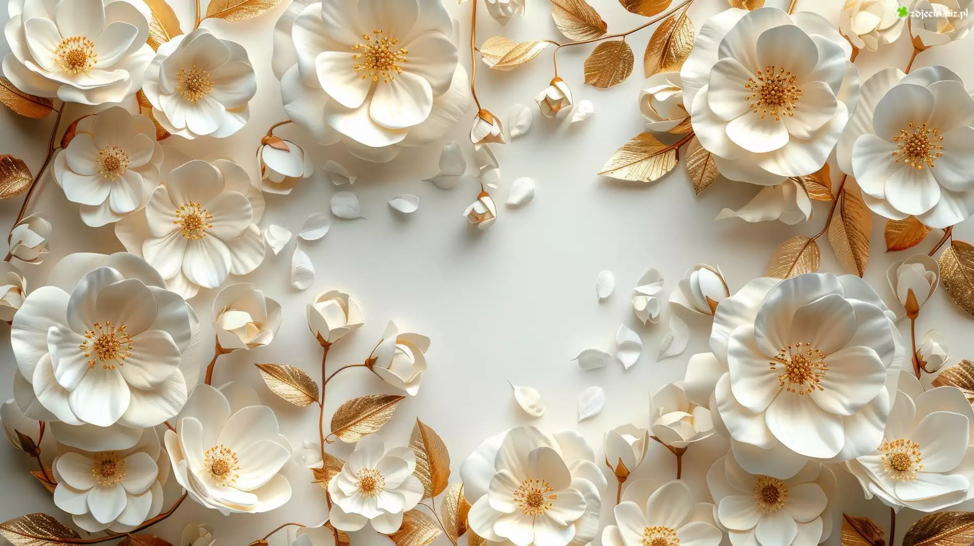 Zdjęcie Białe, Złote, Kwiaty, Liście, Grafika