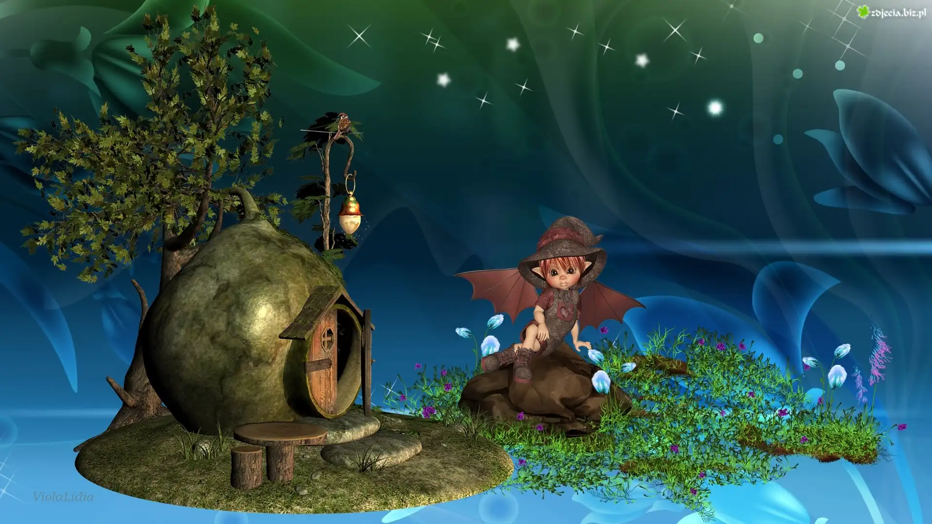Zdjęcie Grafika, Zmierzch, Wieczór, Dom, Domek, Drzewo, Laleczka