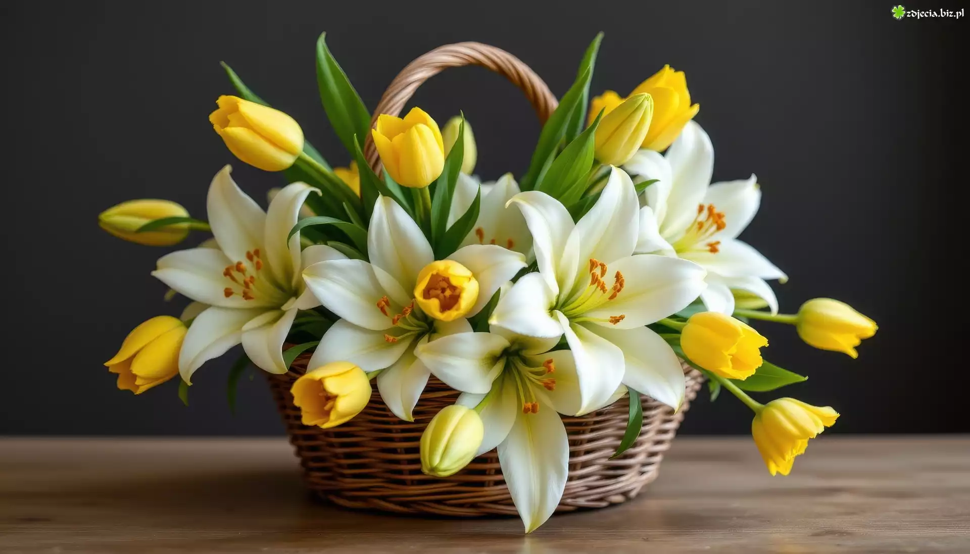 Zdjęcie Kwiaty, Białe, Lilie, Żółte, Tulipany, Koszyk